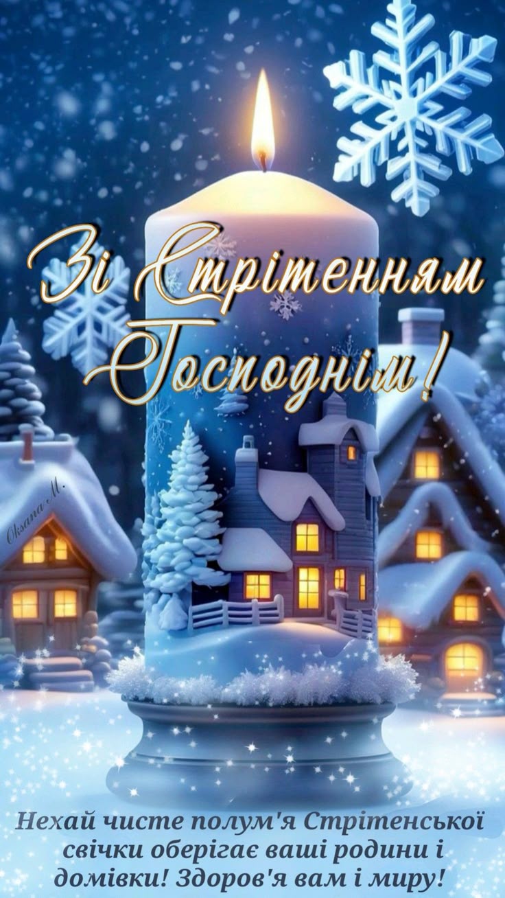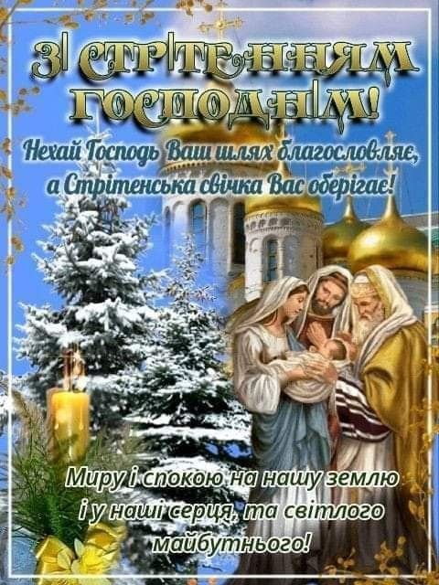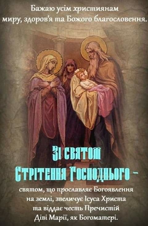 Щороку віряни відзначають одне з найбільших церковних свят – Стрітення Господнє. За новим календарем у 2026 році воно припадає на 2 лютого. Свято символізує зустріч Бога з людством і пов’язане з біблійною історією про праведного Симеона, який у Єрусалимському храмі впізнав у немовляті Ісусі Спасителя. Ми підготували щирі привітання зі Стрітенням, які можна надіслати своїм близьким. Стрітення Господнє: що відомо про свято За Святим Письмом, праведний Симеон, який перекладав біблійні тексти, сумнівався у пророцтві про народження Сина Божого від Діви. Та ангел пообіцяв йому життя доти, доки він не побачить здійснення Божої обітниці. Через багато років Симеон зустрів Марію та Йосипа з немовлям Ісусом у Єрусалимському храмі, куди вони прийшли на сороковий день після народження дитини, як того вимагав юдейський закон. Взявши немовля на руки, старець одразу впізнав у ньому Спасителя. Саме ця подія стала основою свята Стрітення Господнього – символу зустрічі віри, надії та виконання Божого слова. Привітання зі святом Стрітення Господнього 2026 у прозі “Зі Стрітенням Господнім 2026! Нехай у серці буде тепло, у домі – затишок, а поруч – люди, з якими легко йти вперед”. *** “Вітаю зі Стрітенням Господнім! Нехай це світле свято принесе у ваше життя спокій, віру та надію. Бажаю, щоб у серці завжди було тепло, а кожен день дарував добрі зустрічі й світлі думки”. *** “Нехай Стрітення принесе у ваше життя світло, віру та спокій. Бажаю, щоб кожна важлива зустріч була доброю, а кожен новий день – наповнений надією”. *** “Зі Стрітенням! Нехай у цей день у вашому домі панують мир і затишок, а всі турботи поступово відступають. Бажаю внутрішньої рівноваги, сили та впевненості у завтрашньому дні”. *** “Вітаю зі святом Стрітення Господнього! Нехай світло цього дня наповнює душу, допомагає знаходити правильні рішення і зберігати віру навіть у непрості моменти”. *** “Зі Стрітенням Господнім 2026! Бажаю, щоб у житті було більше радості, щирих людей поруч і теплих слів, які зігрівають навіть у холодні дні”. *** “Вітаю зі Стрітенням! Нехай кожна важлива зустріч у вашому житті буде доброю, а всі починання приносять спокій і впевненість. Бажаю миру в серці та гармонії в душі”. *** “Зі Стрітенням Господнім 2026! Нехай Господь оберігає, дає мудрість і наповнює серце світлом”. *** “Вітаю зі Стрітенням Господнім 2026! Хай серце буде відкритим до добра, а думки – світлими”. Привітання зі Стрітенням Господнім 2026 у картинці