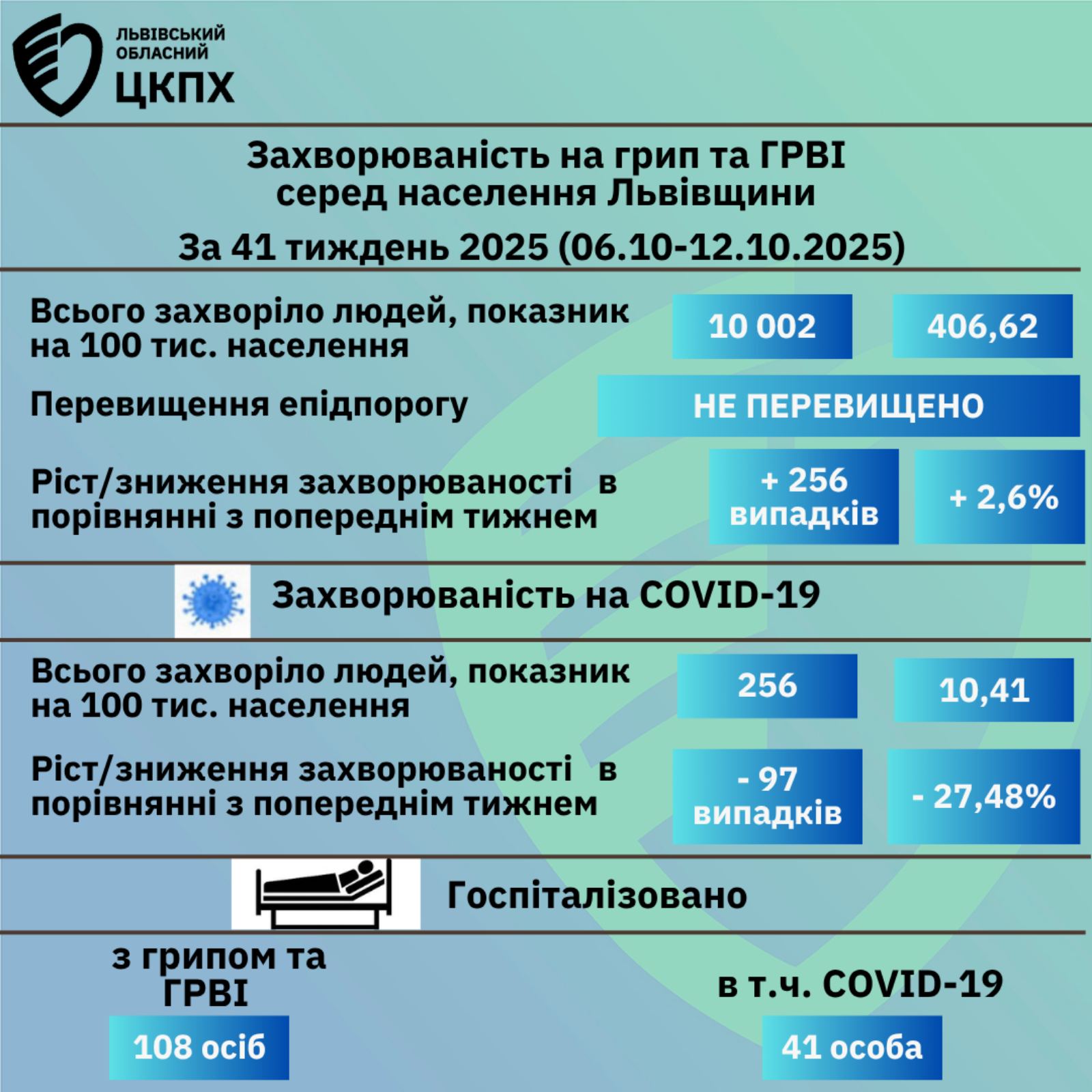 Кількість хворих на ГРВІ за попередній тиждень перетнула межу 10 тисяч людей. З них майже 5 тисяч — діти до 18 років. Про це повідомила генеральна директорка Львівського обласного центру контролю та профілактики хвороб Наталія Іванченко-Тімко у неділю, 12 жовтня. Кількість хворих на ГРВІ зросла В порівнянні з минулим тижнем, кількість хворих, які звернулися до лікарів з симптомами інфекції, зросла майже на 300 людей. Найбільш ураженою віковою групою є діти до 14 років. Серед дорослих найбільше захворівших серед людей від 30 до 64 років. Госпіталізовано 108 пацієнтів, в тому числі, з коронавірусною інфекцією — 41 особа. У регіоні одночасно циркулює одразу декілька видів вірусу Хворобу викликали аденовірус, риновірус, метапневмовірус, риносинтиційний вірус і коронавірус. Лабораторно підтверджено 256 випадків з них 30 серед дітей. Госпіталізовано 40 пацієнтів, з них 10 дітей. Наталія Іванченко-Тімко зазначала, що в аптеках доступні вакцини проти грипу, призначені для сезону 2025–2026 років.