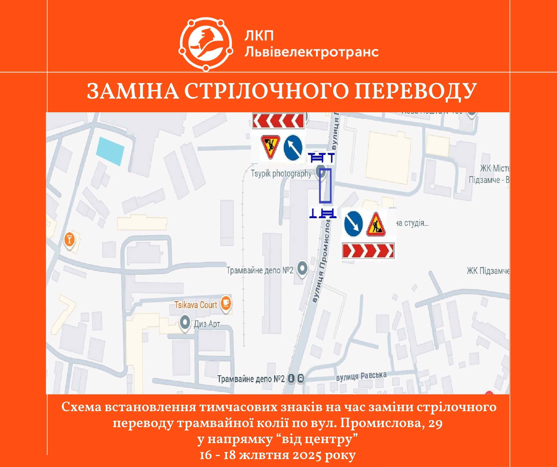 У ніч з 16 на 17 жовтня працівники служби колії ЛКП “Львівелектротранс” виконуватимуть аварійні роботи із заміни стрілочного переводу трамвайної колії на вулиці Промисловій у Львові. Водіїв просять, за можливості, оминати ділянку. Скільки часу будуть тривати роботи Як повідомили у підприємстві, роботи триватимуть від 21:00 четверга, 16 жовтня, до суботи, 18 жовтня. Водіїв просять оминати ділянку, або ж обирати максимально безпечну швидкість. “Аварійні роботи передбачають розбирання бруківки, відтак необережні маневри можуть призвести до небажаних наслідків. Тому просимо автомобілістів бути уважними та обережними на період виконання даних робіт” — зазначили у Львівелектротрансі. На час ремонтних робіт автомобільний рух та рух трамваю №6 не буде реорганізовано, лише сповільнено. Ділянку ремонту позначать відповідними знаками. Пасажирам радять користуватись онлайн-відстеженням транспорту на офіційному сайті ЛКП “Львівелектротранс”.