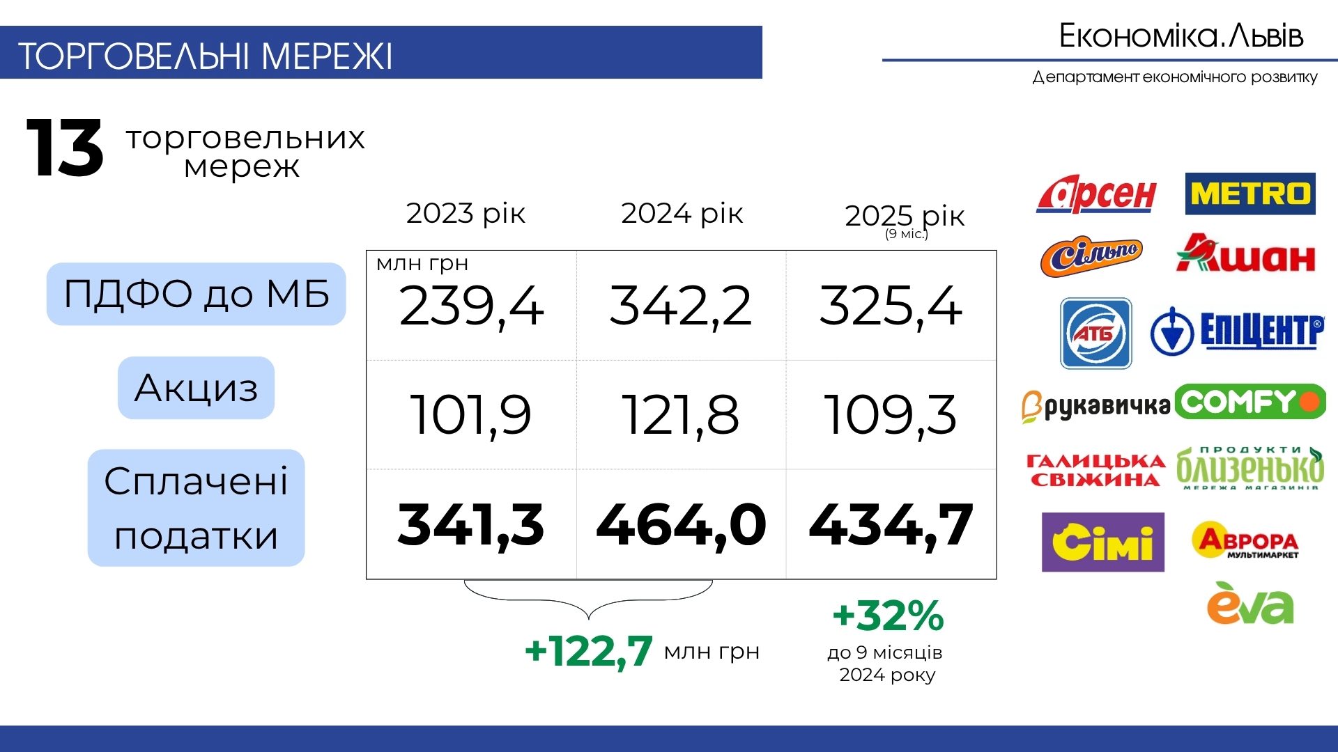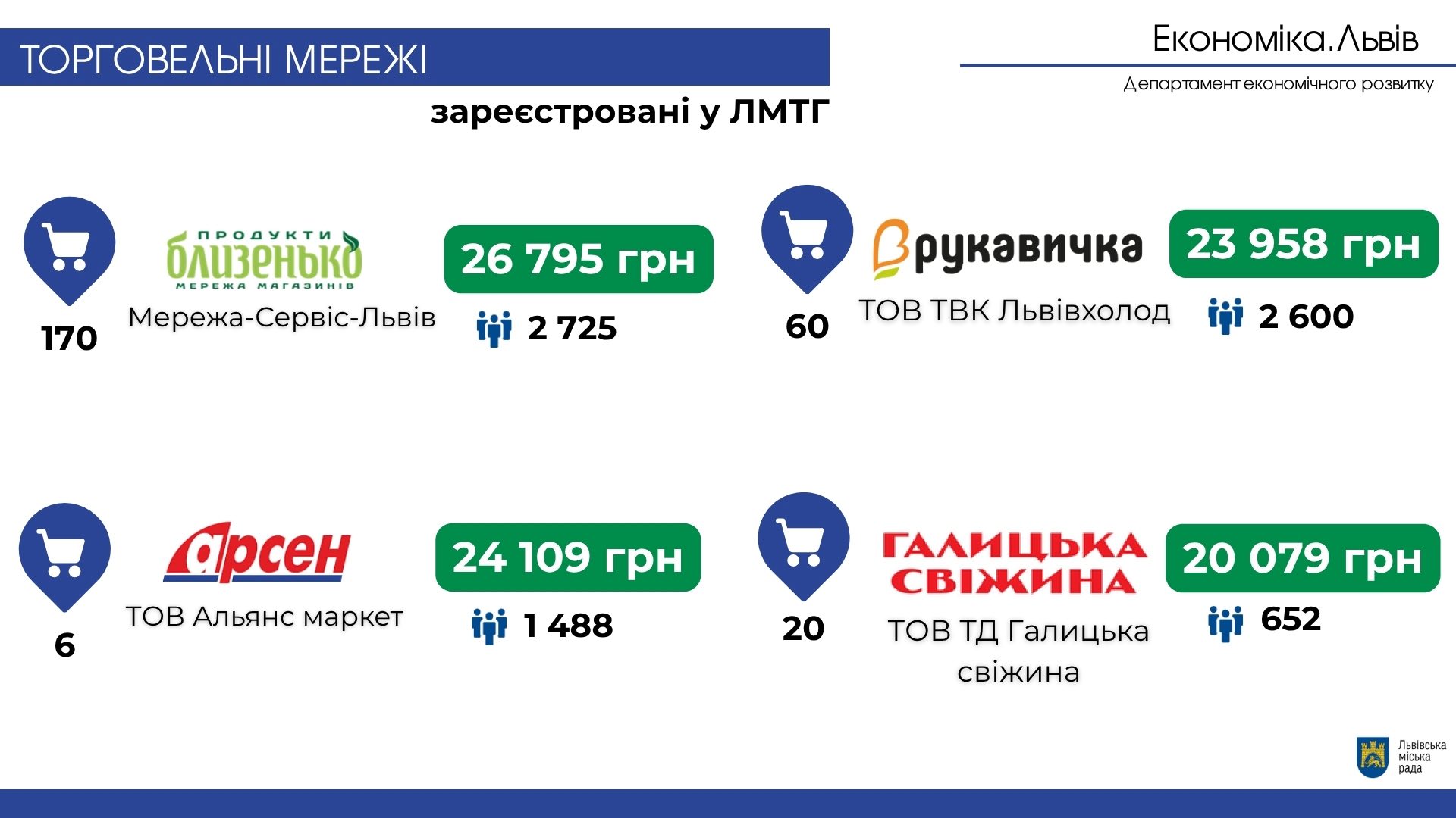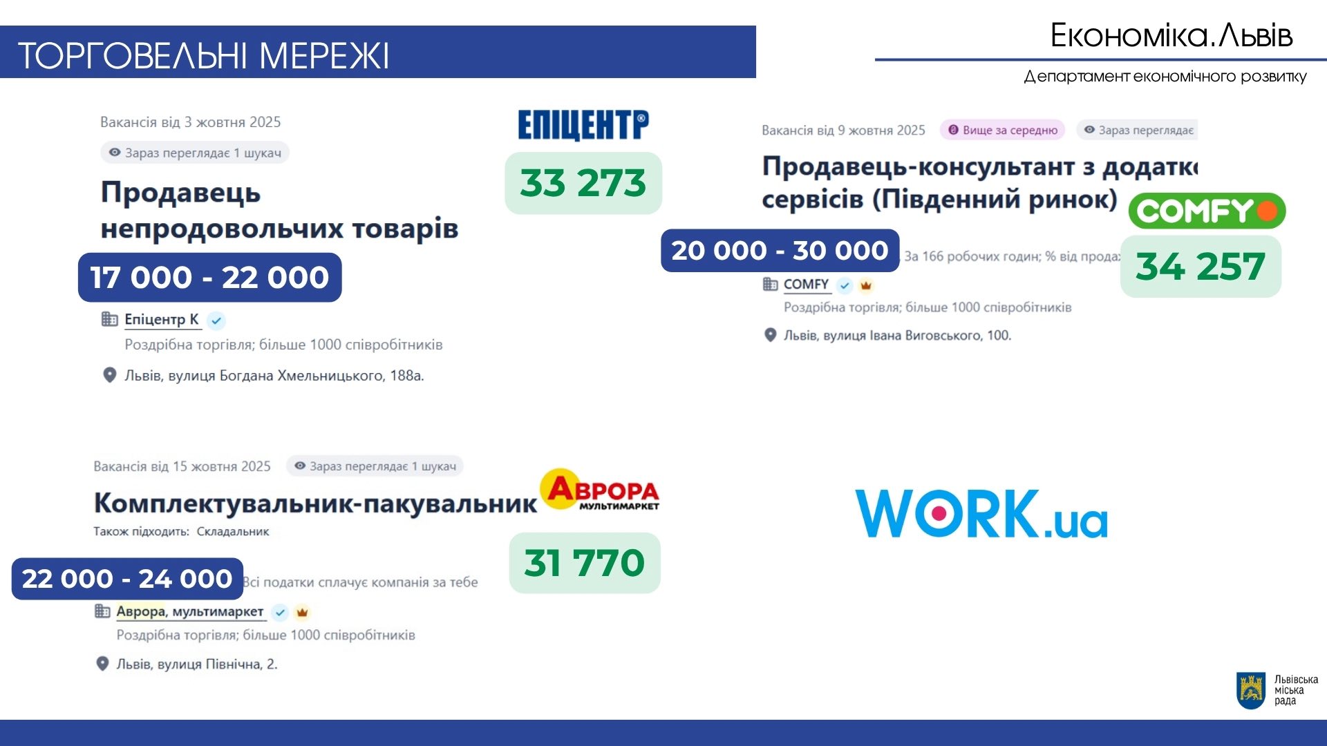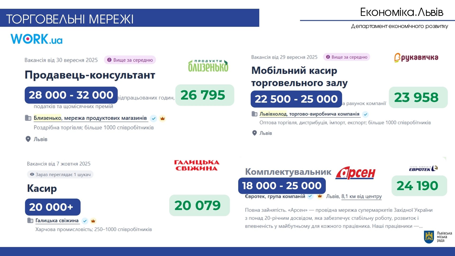 У Департаменті економічного розвитку Львівської міської ради проаналізували рівень заробітної плати у 13 торгових мережах міста. Дослідження показало, що більшість компаній виплачують зарплату на рівні або вище середнього по ринку. Про це під час засідання виконавчого комітету 17 жовтня повідомила директорка департаменту Інна Свистун. Лідери за зарплатами Згідно з даними дослідження, середня заробітна плата у торгових мережах Львова складає 23 тисячі гривень. Більшість компаній, що потрапили до аналізу, виплачують зарплати на рівні або навіть вище зазначеного показника. Найвищі офіційні заробітні плати зафіксовані у мережах, де середній рівень доходу працівників значно перевищує середні показники по місту, зокрема: «Близенько» — 26 795 грн (2 725 працівників); «Арсен» — 24 109 грн (1 488 працівників); «Рукавичка» — 23 958 грн (2 600 працівників); «Галицька свіжина» — 20 079 грн (652 працівників). Середній рівень зарплат у Львові у торгівельних мережах, що зареєстровані поза межами Львівської МТГ: COMFY – 34 257 грн (139 працівників); «Епіцентр» – 33 273 грн (1 610 працівників); «Аврора» – 31 770 грн (424 працівники); METRO – 30 953 грн (274 працівники); «Ашан» – 21 165 грн(494 працівники). Для ще 4 мереж, що не зареєстровані у Львові, для аналізу взяли середній рівень зарплат по Україні, оскільки в розрізі міста відповідні дані отримати не вдалося. В середньому по Україні ці показники такі: АТБ – 40 865 грн; EVA – 27 016 грн; «Сільпо» – 25 688 грн; «Сімі» – 20 903 грн 325 мільйонів гривень для міського бюджету «Податок на дохід фізичних осіб, які сплачують торгівельні мережі, є одним із основних джерел наповнення міського бюджету. Цього року 13 проаналізованих мереж сплатили вже 325 мільйонів гривень ПДФО. Порівняно з аналогічним періодом минулого року, ми бачимо значний ріст у 32% – це дуже вагомий показник, за що ми щиро дякуємо представникам бізнесу», — пояснила директорка департаменту економічного розвитку Інна Свистун. Окрім цього, вона зазначила, що шість з 13 проаналізованих мереж отримають відзнаки за соціальну відповідальність бізнесу. Серед них компанії «Епіцентр», «Близенько», «Рукавичка», METRO, «Аврора» та COMFY. Нагадаємо, раніше у Львівській міській раді також перевірили зарплати у 26 найбільших готелях міста. Виявилось, що деякі готелі теж платять працівникам менше мінімальної зарплати, що є порушенням закону. Згодом, провели аналітику у львівських ресторанах і виявили, що працівники отримують від 3 тис. грн зарплати замість обіцяних 30. Станом на вересень, офіційні зарплати у ресторанах Львова залишилися значно нижчими, ніж вказані у вакансіях.
