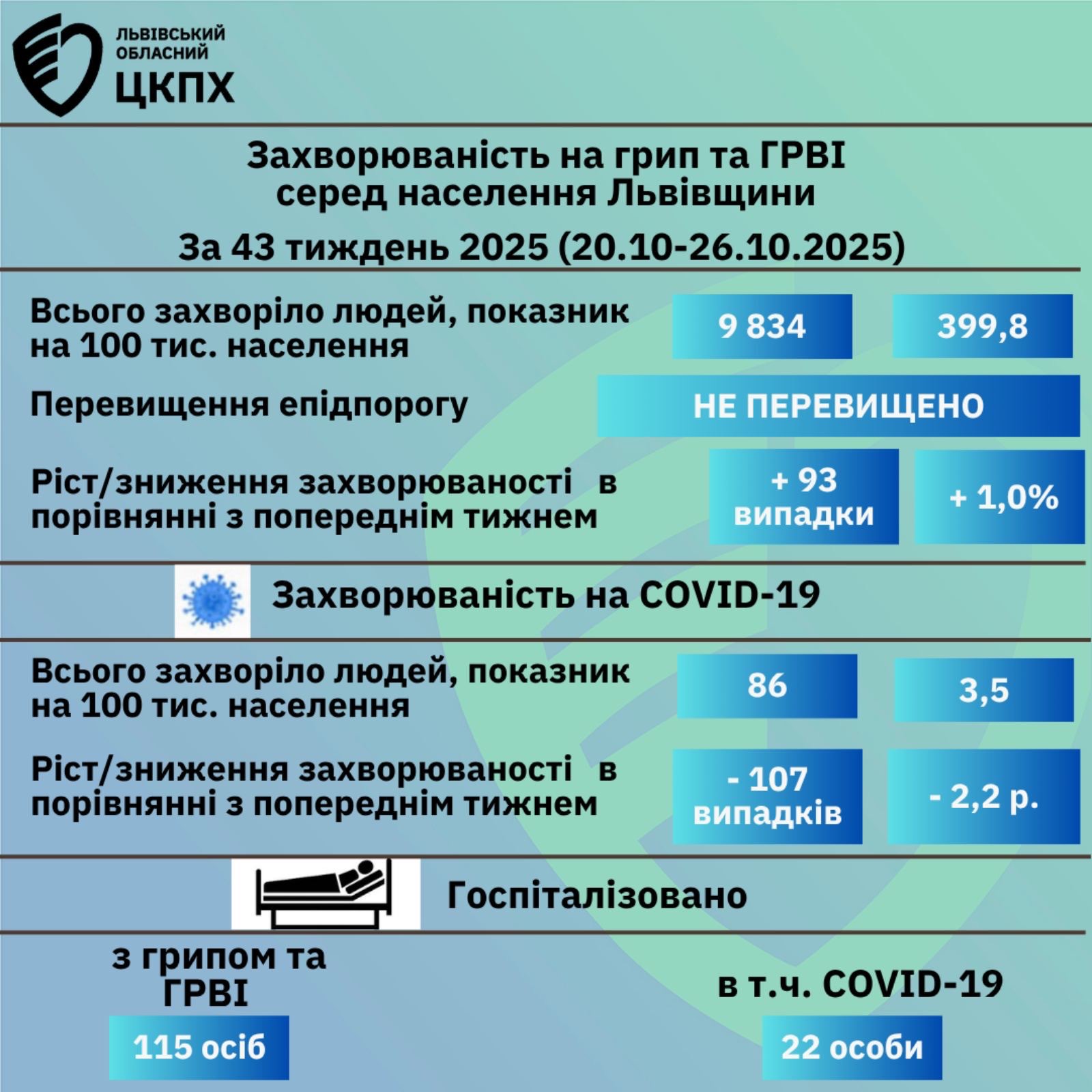 Кількість хворих на ГРВІ за попередній тиждень сягнула майже 10 тисяч людей. Про це повідомила генеральна директорка Львівського обласного центру контролю та профілактики хвороб Наталія Іванченко-Тімко у неділю, 26 жовтня. В порівнянні з минулим тижнем, кількість хворих, які звернулися до лікарів з симптомами інфекції, зросла на 93 випадки. Хоча епідпоріг захворюваності на цьому тижні не перевищено, Наталія Іванченко-Тімко нагадує про правила поведінки в осінньо-зимовий час:“Кашльовий етикет, вітамінізована їжа, режим сну і відпочинку зроблять наш організм менш уразливим! І, звісно, захворіли - залишіться дома.” — зазначила лікарка. Нагадаємо, На Львівщині двоє людей померли від Covid-19. До того ж на Львівщині вперше за п’ять років наразі в аптеках немає вакцини від грипу.