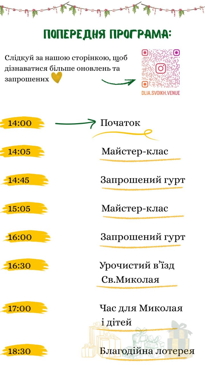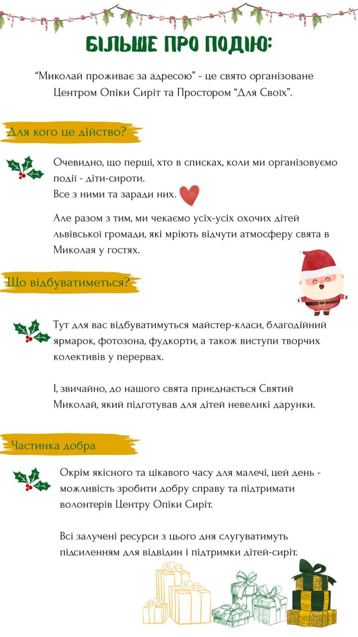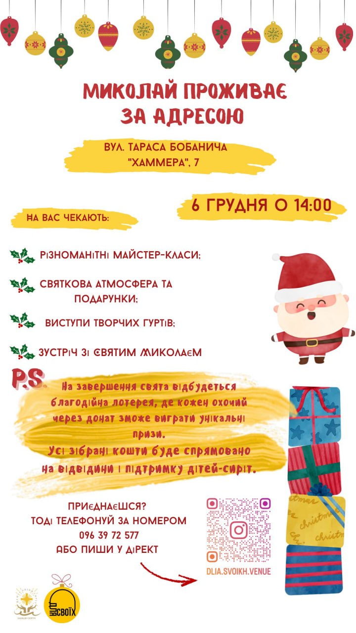 У суботу, 6 грудня, у львівському Домі Милосердя Святого Миколая відбудеться благодійне свято “Миколай проживає за адресою”. Малята зможуть завітати в гості до Чудотворця, відвідати майстер-класи, послухати живий виступ і подякувати за подарунки, натомість на учасників очікує аукціон, гроші з якого направлять на підтримку дітей-сиріт. Програма події та благодійна мета На дітей чекатимуть майстер-класи, фотозона, зустріч зі Святим Миколаєм, подарунок від нього та багато смаколиків під супровід музичних гуртів. А на завершення — благодійна лотерея, де можна виграти призи за донати. “Подія має особливу місію. Оскільки організаторами події є Центр Опіки Сиріт, то, звичайно, що багато маленьких гостей — це саме сироти, які перебувають під опікою Центру та для яких організовується це дійство”, — зазначили організатори. Усіх львів’ян закликають долучитися до служіння дітям-сиротам, бо всі донати і пожертви з цього дня будуть спрямовані на відвідини і підтримку дітей волонтерами Центру опіки сиріт впродовж наступного року. Всю детальну інформацію можна знайти на Instagram сторінці “Простору для Своїх”. Адреса проведення: вулиця Тараса Бобанича, 7. Свято стартує об 14:00.