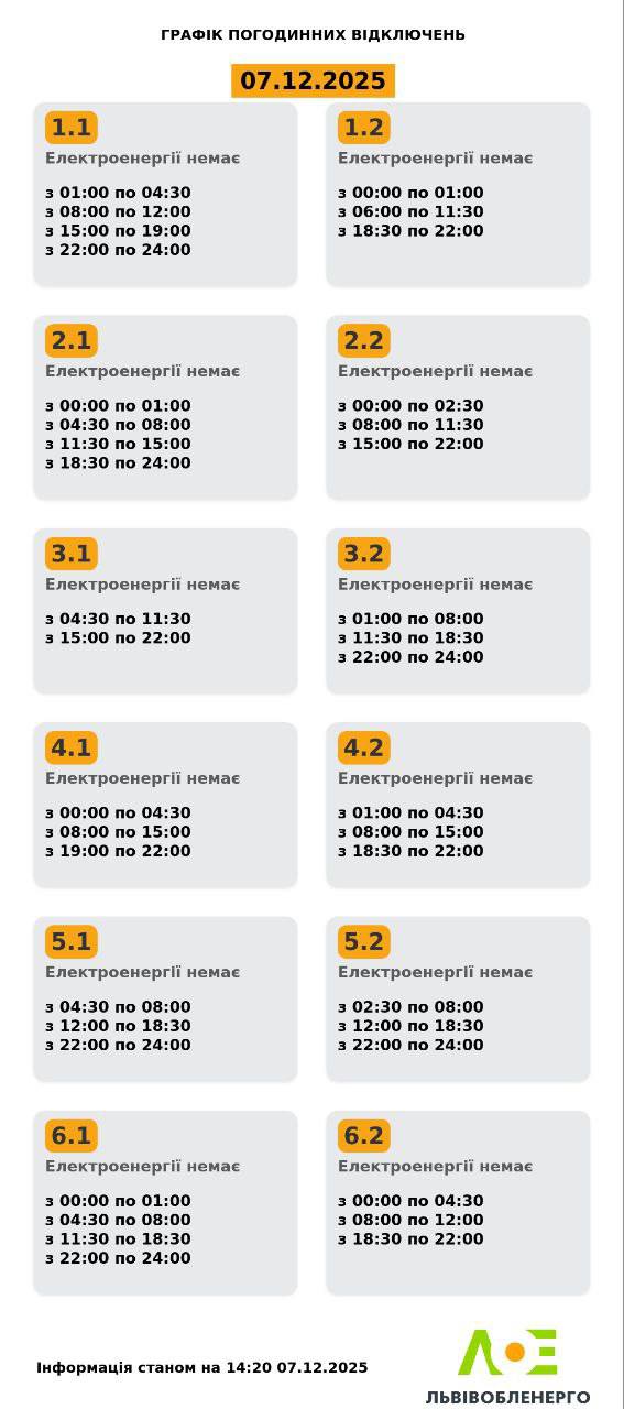 У Львові та області у неділю, 7 грудня, діятимуть графіки відключень електроенергії. Світло вимикатимуть усім групам. Про це повідомили у Львівобленерго. Актуальний графік Графік погодинних відключень на 07.12.2025 Інформація станом на 14:21 07.12.2025 Група 1.1. Електроенергії немає з 01:00 до 04:30, з 08:00 до 12:00, з 15:00 до 19:00, з 22:00 до 24:00. Група 1.2. Електроенергії немає з 00:00 до 01:00, з 06:00 до 11:30, з 18:30 до 22:00. Група 2.1. Електроенергії немає з 00:00 до 01:00, з 04:30 до 08:00, з 11:30 до 15:00, з 18:30 до 24:00. Група 2.2. Електроенергії немає з 00:00 до 02:30, з 08:00 до 11:30, з 15:00 до 22:00. Група 3.1. Електроенергії немає з 04:30 до 11:30, з 15:00 до 22:00. Група 3.2. Електроенергії немає з 01:00 до 08:00, з 11:30 до 18:30, з 22:00 до 24:00. Група 4.1. Електроенергії немає з 00:00 до 04:30, з 08:00 до 15:00, з 19:00 до 22:00. Група 4.2. Електроенергії немає з 01:00 до 04:30, з 08:00 до 15:00, з 18:30 до 22:00. Група 5.1. Електроенергії немає з 04:30 до 08:00, з 12:00 до 18:30, з 22:00 до 24:00. Група 5.2. Електроенергії немає з 02:30 до 08:00, з 12:00 до 18:30, з 22:00 до 24:00. Група 6.1. Електроенергії немає з 00:00 до 01:00, з 04:30 до 08:00, з 11:30 до 18:30, з 22:00 до 24:00. Група 6.2. Електроенергії немає з 00:00 до 04:30, з 08:00 до 12:00, з 18:30 до 22:00. Як дізнатися свою групу відключень До слова, дізнатись свою чергу аварійних чи погодинних відключень можна: на сайті “Львівобленерго” у розділі «Чому немає світла»: https://poweron.loe.lviv.ua/ У чат-ботах: “Львівобленерго” у Viber (для побутових споживачів): https://www.viber.com/loebot “Львівобленерго” у Telegram (для побутових споживачів): https://t.me/loeserviceBot “Львівобленерго Бізнес” у Viber (для юридичних споживачів): www.viber.com/loebiznesbot “Львівобленерго Бізнес” у Telegram (для юридичних споживачів): https://t.me/loebiznesbot у мобільному застосунку КомКом: https://loe.lviv.ua/page/komkom-app