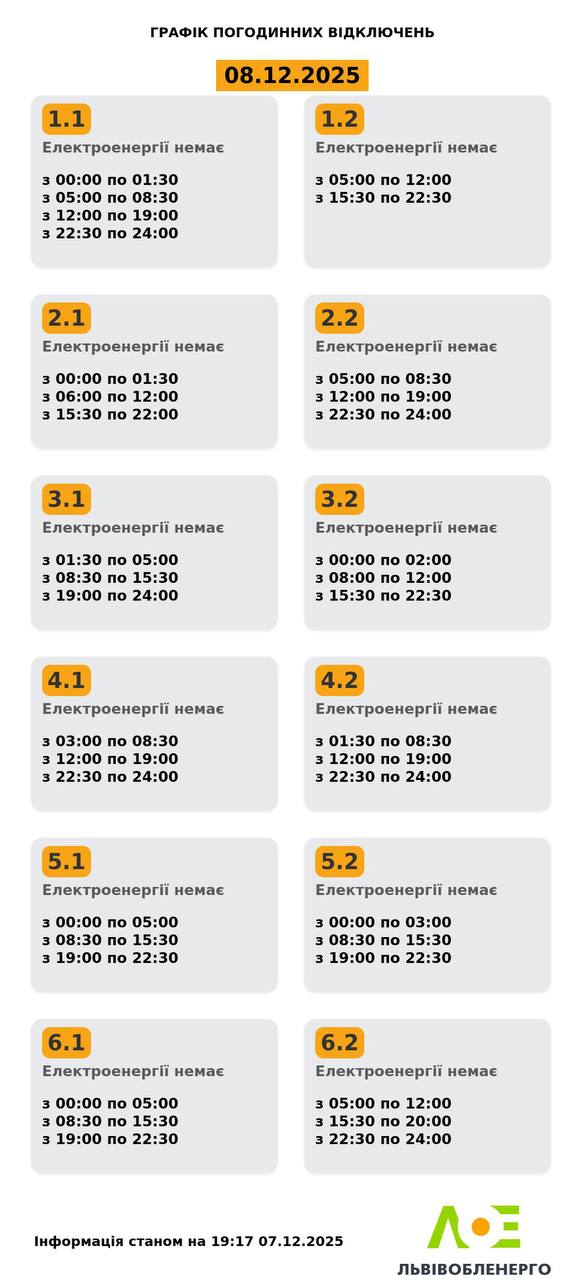 У Львові та області у понеділок, 8 грудня, діятимуть графіки відключень електроенергії. Світло вимикатимуть усім групам. Про це повідомили у Львівобленерго. Актуальний графік Графік погодинних відключень на 08.12.2025 Інформація станом на 19:17 07.12.2025 Група 1.1. Електроенергії немає з 00:00 до 01:30, з 05:00 до 08:30, з 12:00 до 19:00, з 22:00 до 24:00 Група 1.2. Електроенергії немає з 05:00 до 12:00, з 15:30 до 22:30. Група 2.1. Електроенергії немає з 00:00 до 01:30, з 06:00 до 12:00, з 15:30 до 22:00 Група 2.2. Електроенергії немає з 05:00 до 08:30, з 12:00 до 19:00, з 22:30 до 24:00. Група 3.1. Електроенергії немає з 01:30 до 05:00, з 08:30 до 15:30, з 19:00 до 24:00. Група 3.2. Електроенергії немає з 00:00 до 02:00, з 08:00 до 12:00, з 15:30 до 22:30. Група 4.1. Електроенергії немає з 03-:00 до 08:30, з 12:00 до 19:00, 22:30 до 24:00. Група 4.2. Електроенергії немає з 01:30 до 08:30, з 12:00 до 19:00, з 22:30 до 24:00. Група 5.1. Електроенергії немає з 00:00 до 05:00, з 08:30 до 15:30, з 19:00 до 22:30. Група 5.2. Електроенергії немає з 00:00 до 03:00, з 08:30 до 15:30, з 19:00 до 22:30. Група 6.1. Електроенергії немає з 00:00 до 05:00, з 08:30 до 15:30, з 19:00 до 22:30. Група 6.2. Електроенергії немає з 05:00 до 12:00, з 15:30 до 20:00, з 22:30 до 24:00. Як дізнатися свою групу відключень До слова, дізнатись свою чергу аварійних чи погодинних відключень можна: на сайті “Львівобленерго” у розділі «Чому немає світла»: https://poweron.loe.lviv.ua/ У чат-ботах: “Львівобленерго” у Viber (для побутових споживачів): https://www.viber.com/loebot “Львівобленерго” у Telegram (для побутових споживачів): https://t.me/loeserviceBot “Львівобленерго Бізнес” у Viber (для юридичних споживачів): www.viber.com/loebiznesbot “Львівобленерго Бізнес” у Telegram (для юридичних споживачів): https://t.me/loebiznesbot у мобільному застосунку КомКом: https://loe.lviv.ua/page/komkom-app