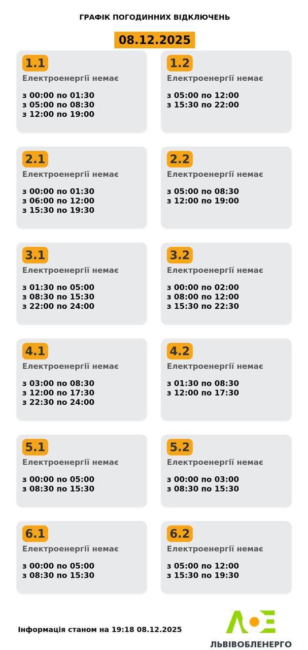 У Львові та області у понеділок, 8 грудня, діятимуть графіки відключень електроенергії. Світло вимикатимуть усім групам. Про це повідомили у Львівобленерго. Актуальний графік Графік погодинних відключень на 08.12.2025 Інформація станом на 19:18 09.12.2025 Група 1.1. Електроенергії немає з 00:00 до 01:30, з 05:00 до 08:30, з 12:00 до 19:00. Група 1.2. Електроенергії немає з 05:00 до 12:00, з 15:30 до 22:00. Група 2.1. Електроенергії немає з 00:00 до 01:30, з 06:00 до 12:00, з 15:30 до 19:30 Група 2.2. Електроенергії немає з 05:00 до 08:30, з 12:00 до 19:00. Група 3.1. Електроенергії немає з 01:30 до 05:00, з 08:30 до 15:30, з 22:00 до 24:00. Група 3.2. Електроенергії немає з 00:00 до 02:00, з 08:00 до 12:00, з 15:30 до 22:30. Група 4.1. Електроенергії немає з 03-:00 до 08:30, з 12:00 до 19:00, 22:30 до 24:00. Група 4.2. Електроенергії немає з 01:30 до 08:30, з 12:00 до 17:30. Група 5.1. Електроенергії немає з 00:00 до 05:00, з 08:30 до 15:30. Група 5.2. Електроенергії немає з 00:00 до 03:00, з 08:30 до 15:30. Група 6.1. Електроенергії немає з 00:00 до 05:00, з 08:30 до 15:30. Група 6.2. Електроенергії немає з 05:00 до 12:00, з 15:30 до 19:30. Як дізнатися свою групу відключень До слова, дізнатись свою чергу аварійних чи погодинних відключень можна: на сайті “Львівобленерго” у розділі «Чому немає світла»: https://poweron.loe.lviv.ua/ У чат-ботах: “Львівобленерго” у Viber (для побутових споживачів): https://www.viber.com/loebot “Львівобленерго” у Telegram (для побутових споживачів): https://t.me/loeserviceBot “Львівобленерго Бізнес” у Viber (для юридичних споживачів): www.viber.com/loebiznesbot “Львівобленерго Бізнес” у Telegram (для юридичних споживачів): https://t.me/loebiznesbot у мобільному застосунку КомКом: https://loe.lviv.ua/page/komkom-app