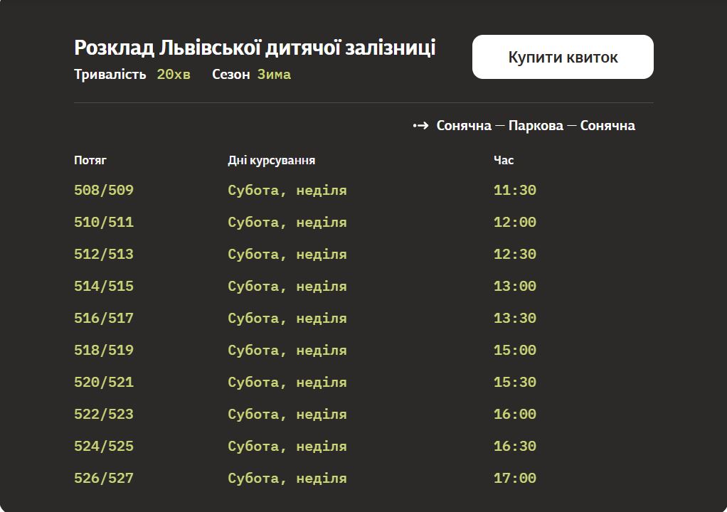 У Львові вперше розпочнеться сезон зимових пасажирських перевезень на дитячій залізниці. Потяги курсуватимуть 26–28 грудня. Про це у середу, 17 грудня, повідомили в “Укрзалізниці” Кататися на поїзді можна буде на вихідні Квитки можна придбати онлайн — через сайт Укрзалізниці. Також за кожен куплений квиток пасажирам нараховують 250 “обіймашок”, які можна обміняти на знижки та послуги партнерів у межах програми лояльності. Покататися на поїзді Львівської дитячої залізниці можна буде у неділю та суботу. Окрім поїздок, діти віком від 10 до 12 років можуть долучитися до навчання на дитячій залізниці — спробувати себе в ролі машиніста, диспетчера або провідника. Заняття безкоштовні, запис — через офіційний сайт. До слова, Львівська дитяча залізниця має 1,2 кілометра вузькоколійної колії та дві станції — “Паркова” і “Сонячна”.
