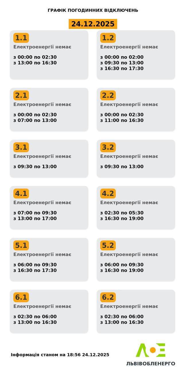 На Львівщині у середу, 24 грудня, будуть діяти графіки відключень електроенергії. Світло вимикатимуть усім групам. Про це повідомили у Львівобленерго. Актуальний графік Інформація станом на 18:56 24.12.2025 Група 1.1. Електроенергії немає з 00:00 до 02:30, з 13:00 до 16:30. Група 1.2. Електроенергії немає з 00:00 до 02:00, з 09:30 до 13:00, з 16:30 до 17:30. Група 2.1. Електроенергії немає з 00:00 до 02:30, з 07:00 до 13:00. Група 2.2. Електроенергії немає з 00:00 до 02:30, з 11:00 до 16:30. Група 3.1. Електроенергії немає з 09:30 до 13:00. Група 3.2. Електроенергії немає з 09:30 до 13:00. Група 4.1. Електроенергії немає з 07:00 до 09:30, з 13:00 до 17:00. Група 4.2. Електроенергії немає з 02:30 до 05:30, з 16:30 до 19:00. Група 5.1. Електроенергії немає з 06:00 до 09:30, з 16:30 до 17:30. Група 5.2. Електроенергії немає з 06:00 до 09:30, з 16:30 до 19:00. Група 6.1. Електроенергії немає з 02:30 до 06:00, з 13:00 до 16:30. Група 6.2. Електроенергії немає з 02:30 до 06:00, з 13:00 до 16:30. Як дізнатися свою групу відключень До слова, дізнатись свою чергу аварійних чи погодинних відключень можна: на сайті “Львівобленерго” у розділі «Чому немає світла»: https://poweron.loe.lviv.ua/ У чат-ботах: “Львівобленерго” у Viber (для побутових споживачів): https://www.viber.com/loebot “Львівобленерго” у Telegram (для побутових споживачів): https://t.me/loeserviceBot “Львівобленерго Бізнес” у Viber (для юридичних споживачів): www.viber.com/loebiznesbot “Львівобленерго Бізнес” у Telegram (для юридичних споживачів): https://t.me/loebiznesbot у мобільному застосунку КомКом: https://loe.lviv.ua/page/komkom-app