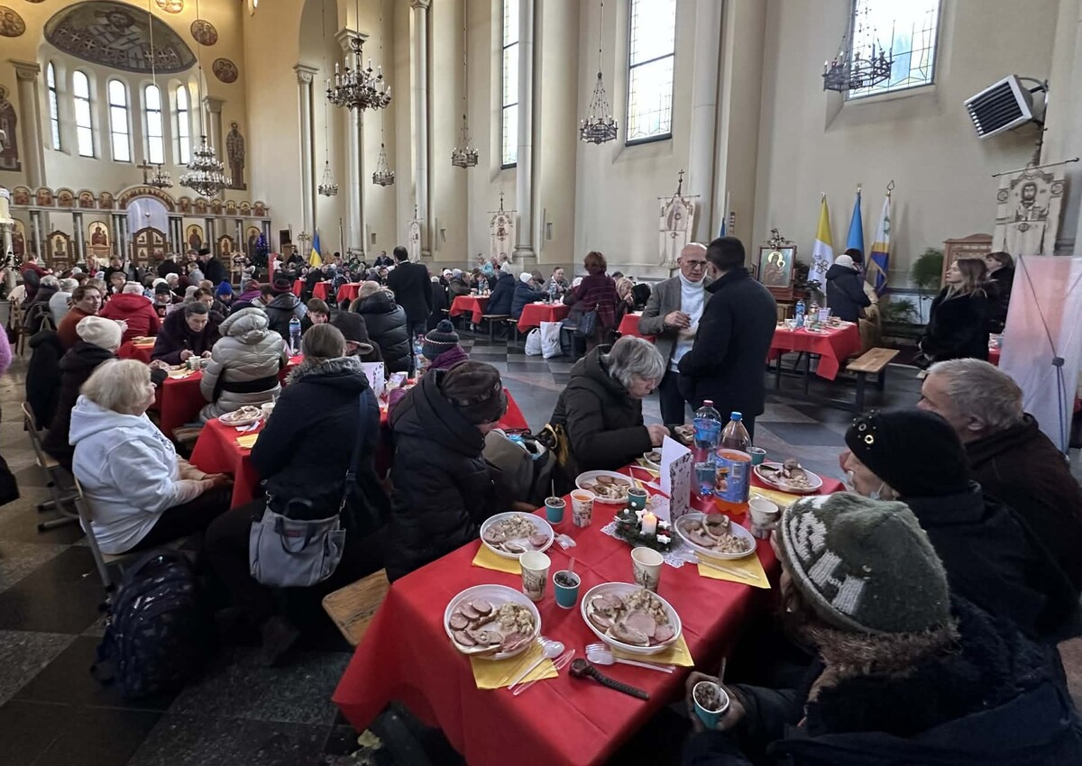 У різних локаціях Львова у різдвяні дні провели святкові обіди для майже 200 людей, які опинилися у складних життєвих обставинах. Зокрема, різдвяну трапезу організували у храмі Покрови Пресвятої Богородиці на вулиці Личаківській. Про це 25 грудня повідомили у Львівській міській раді. Молитва, колядки і вертеп До святкового обіду долучилися майже 200 людей — бездомні, внутрішньо переміщені особи та самотні літні мешканці Львова. Трапеза розпочалася зі спільної молитви та благословення священника. Після цього для гостей виступив різдвяний вертеп, а в храмі лунали колядки. Святковий обід організувала Спільнота святого Егідія — міжнародна організація, яка щороку у різдвяні дні збирає за спільним столом людей, які опинилися у складних життєвих обставинах. «Для нас велика радість, що сьогодні тут стільки гостей. Сьогодні у 70 країнах світу спільнота святкує Різдво разом з бідними, з людьми літнього віку, з біженцями», — зазначила координатор «Спільноти святого Егідія» у Львові Іванна Синицька. Різдвяний обід став не лише святковою трапезою, а й можливістю для спілкування, підтримки та відчуття спільноти, що особливо важливо у святкові дні. Загалом упродовж Різдва у Львові тривають благодійні ініціативи для бездомних, внутрішньо переміщених осіб та малозабезпечених мешканців. Їх організовують громадські організації, благодійні фонди, релігійні спільноти та комунальні установи. Зокрема, міський центр соціальних послуг «Джерело» провів різдвяний сніданок і вечерю у муніципальному притулку для бездомних на вулиці Кирилівській. Загалом святкові заходи у місті охоплюють понад 1000 людей.