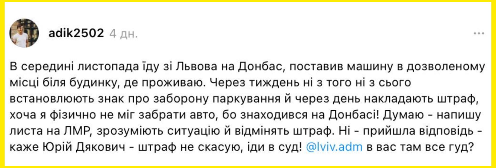 У Львові оштрафували військовослужбовця, який залишив авто біля свого будинку та поїхав виконувати завдання на Донбас. Коли його не було, на цій ділянці встановили новий знак «Зупинку заборонено» і після цього виписали постанову за порушення правил паркування. Про ситуацію він написав у соцмережах 24 грудня. А згодом у коментарі LVIV.MEDIA оштрафований військовий Адріан Козловський розповів, що у мерії йому порадили оскаржити штраф через суд. Військовий попередив, що не зможе перепаркувати авто За словами військовослужбовця, 15 листопада він залишив машину біля дому на вулиці Залізничній, і поїхав до Краматорська. Наприкінці листопада голова ОСББ попередив мешканців будинку про встановлення нових дорожніх знаків. Адріан Козловський одразу звернувся до Львівської міськради з проханням не штрафувати його авто, бо фізично не міг його забрати. “Зараз проводиться ремонт вулиці Залізничної і місце де встановили знаки одне з небагатьох, де можна було припаркувати авто. Оскільки я на той час вже перебував на Донбасі, то я написав на відділ примусового виконання Львівської міської ради, де повідомив, щоб мене не штрафували, бо я фізично не можу забрати авто, а в момент коли я його ставив, то знаку ще не було”, — розповів LVIV.MEDIA військовослужбовець. У мерії йому спершу відповіли, що з 1 вересня до 30 листопада інспектори з паркування не фіксували порушеннями з його автомобілем. Однак уже 2 грудня інспектор з паркування таки виписав на машину військовослужбовця штраф 340 грн за стоянку в зоні дії нового знака 3.34 «Зупинку заборонено». Скарга до міськради: «лише через суд» Після цього Адріан Козловський подав скаргу до Львівської міськради з проханням скасувати штраф та провести службове розслідування. Однак у відповіді з департаменту міської мобільності та вуличної інфраструктури, яку військовослужбовець надав журналістам LVIV.MEDIA, зазначили, що підстав для скасування постанови не вбачають, а оскаржити її можна лише в суді. “Інспектори з паркування фіксують саме факт розташування транспортного засобу в зоні дії знаку… Отже, для скасування постанови інспектора з паркування про накладення адміністративного стягнення необхідно звернутись до суду”, — йдеться у відповіді департаменту міської мобільності та вуличної інфраструктури ЛМР. Після публічного розголосу історії у соцмережах, за словами Козловського, йому зателефонував керівник департаменту, який відповідає за ці питання: «Він визнав, що це недопрацювання з їх сторони. Спочатку була розмова, що інспектор сплатить штраф за мене, але так вийшло, що я вже штраф сплатив, то вони погодились, що він задонатить цю суму на нашу бригаду», — додав військовослужбовець. Окрім цього, за словами Козловського, посадовець пообіцяв розібрати цей випадок на щомісячних зборах паркувальників 30 грудня.