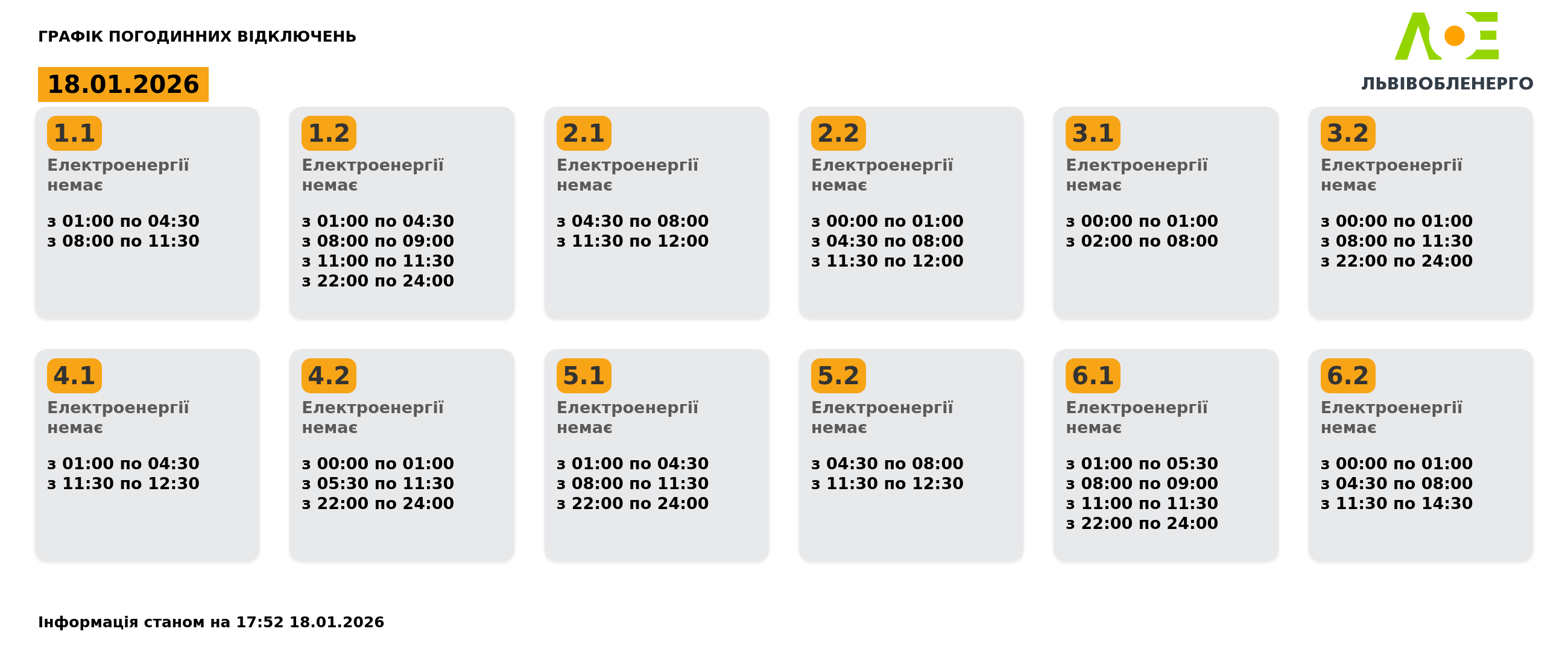 У неділю,18 січня, на Львівщині діятимуть графіки відключення світла. Електроенергію вимикатимуть усім групам. Впродовж доби графіки можуть змінюватись. Про це повідомили у Львівобленерго. Актуальний графік відключень Графік погодинних відключень на 18.01.2026 Інформація станом на 17:53 18.01.2026 Група 1.1. Електроенергії немає з 01:00 до 04:30, з 08:00 до 11:30. Група 1.2. Електроенергії немає з 01:00 до 04:30, з 08:00 до 09:00, з 11:00 до 11:30, з 22:00 до 24:00. Група 2.1. Електроенергії немає з 04:30 до 08:00, з 11:30 до 12:00. Група 2.2. Електроенергії немає з 00:00 до 01:00, з 04:30 до 08:00, з 11:30 до 12:00. Група 3.1. Електроенергії немає з 00:00 до 01:00, з 02:00 до 08:00. Група 3.2. Електроенергії немає з 00:00 до 01:00, з 08:00 до 11:30, з 22:00 до 24:00. Група 4.1. Електроенергії немає з 01:00 до 04:30, з 11:30 до 12:30. Група 4.2. Електроенергії немає з 00:00 до 01:00, з 05:30 до 11:30, з 22:00 до 24:00. Група 5.1. Електроенергії немає з 01:00 до 04:30, з 08:00 до 11:30, з 22:00 до 24:00. Група 5.2. Електроенергії немає з 04:30 до 08:00, з 11:30 до 12:30. Група 6.1. Електроенергії немає з 01:00 до 05:30, з 08:00 до 09:00, з 11:00 до 11:30, з 22:00 до 24:00. Група 6.2. Електроенергії немає з 00:00 до 01:00, з 04:30 до 08:00, з 11:30 до 14:30. Як дізнатися свою групу відключень До слова, дізнатись свою чергу аварійних чи погодинних відключень можна: на сайті “Львівобленерго” у розділі «Чому немає світла»: https://poweron.loe.lviv.ua/ У чат-ботах: “Львівобленерго” у Viber (для побутових споживачів): https://www.viber.com/loebot “Львівобленерго” у Telegram (для побутових споживачів): https://t.me/loeserviceBot “Львівобленерго Бізнес” у Viber (для юридичних споживачів): www.viber.com/loebiznesbot “Львівобленерго Бізнес” у Telegram (для юридичних споживачів): https://t.me/loebiznesbot у мобільному застосунку КомКом: https://loe.lviv.ua/page/komkom-app