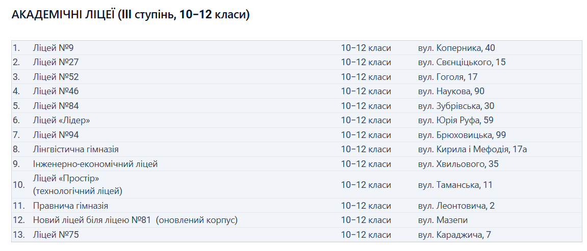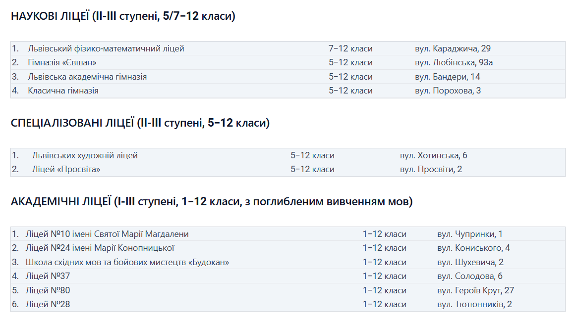 Львів готується до великої реформи старшої школи, яка стартує в Україні з 2027 року. Старшокласники зможуть обирати профіль навчання, а ліцеї стануть академічними, науковими або спеціалізованими. У понеділок, 2 лютого, у місті провели публічне обговорення змін, до якого долучилися освітяни, батьки та депутати. Про це повідомили у пресслужбі Львівської міської. Реформа — це фінальний етап реформи «Нова українська школа» (НУШ), запровадженої ще у 2018 році по всій країні. Її мета — підвищити якість освіти та надати учням можливість свідомо обирати профіль навчання відповідно до власних зацікавлень і планів на майбутнє. Що зміниться у школах Львова: З 2027 року усі школи будуть класифікувати за таким поділом: Поділ шкіл за рівнями: Учні після 9 класу зможуть обирати ліцей або професійний коледж, навчання буде профільним: можна зосередитися на предметах, важливих для вступу до університету або розвитку професійних навичок. Обов’язкові предмети для всіх ліцеїв: українська мова, література, математика, історія, англійська, фізкультура та захист України. Адаптація учнів: 10 клас стане «пробним» — можна визначитися з профілем і змінити його протягом року. У 11–12 класах — поглиблене вивчення профільних предметів. Типи ліцеїв: Науковий: поглиблене вивчення природничих, технічних і гуманітарних наук, проєктна робота, співпраця з університетами. Спеціалізований: спорт або мистецтво, з професійним наставництвом. Академічний: профільне навчання за напрямками: мовно-літературний, STEM, економічний, спортивний та інші. Також побачити розташування ліцеїв можна на карті . Як зміниться мережа шкіл: Для шкіл, які не стануть ліцеями, суттєвих змін не буде: вони залишаться початковими школами або гімназіями. При цьому в кожному мікрорайоні забезпечать наявність закладів для дітей 1–9 класів, щоб навчання було максимально доступним і не вимагало тривалого доїзду. У мікрорайонах залишаться початкові школи і гімназії, щоб діти 1–9 класів могли вчитися поруч із домом. Ліцеї з’являться у зручних локаціях для старшокласників. Поступовий перехід дозволить дітям завершити навчання у своїй школі. Що вже зроблено: Визначено пілотні ліцеї, які з вересня 2026 року працюватимуть за новою системою: ліцей «Лідер», школа №84 та Лінгвістична гімназія. Деякі школи вже адаптувалися до нової моделі — наприклад, школа №23 стала гімназією. Пілотування дозволить учням на рік раніше спробувати навчання за 12-річною програмою, обирати профіль і скоротити час отримання бакалаврського рівня освіти. За словами представників міської ради, реформа спрямована на розвиток індивідуальних здібностей учнів, забезпечення свободи вибору та сучасних умов навчання, а також на поступове впровадження змін у всіх школах Львова до 1 вересня 2027 року.