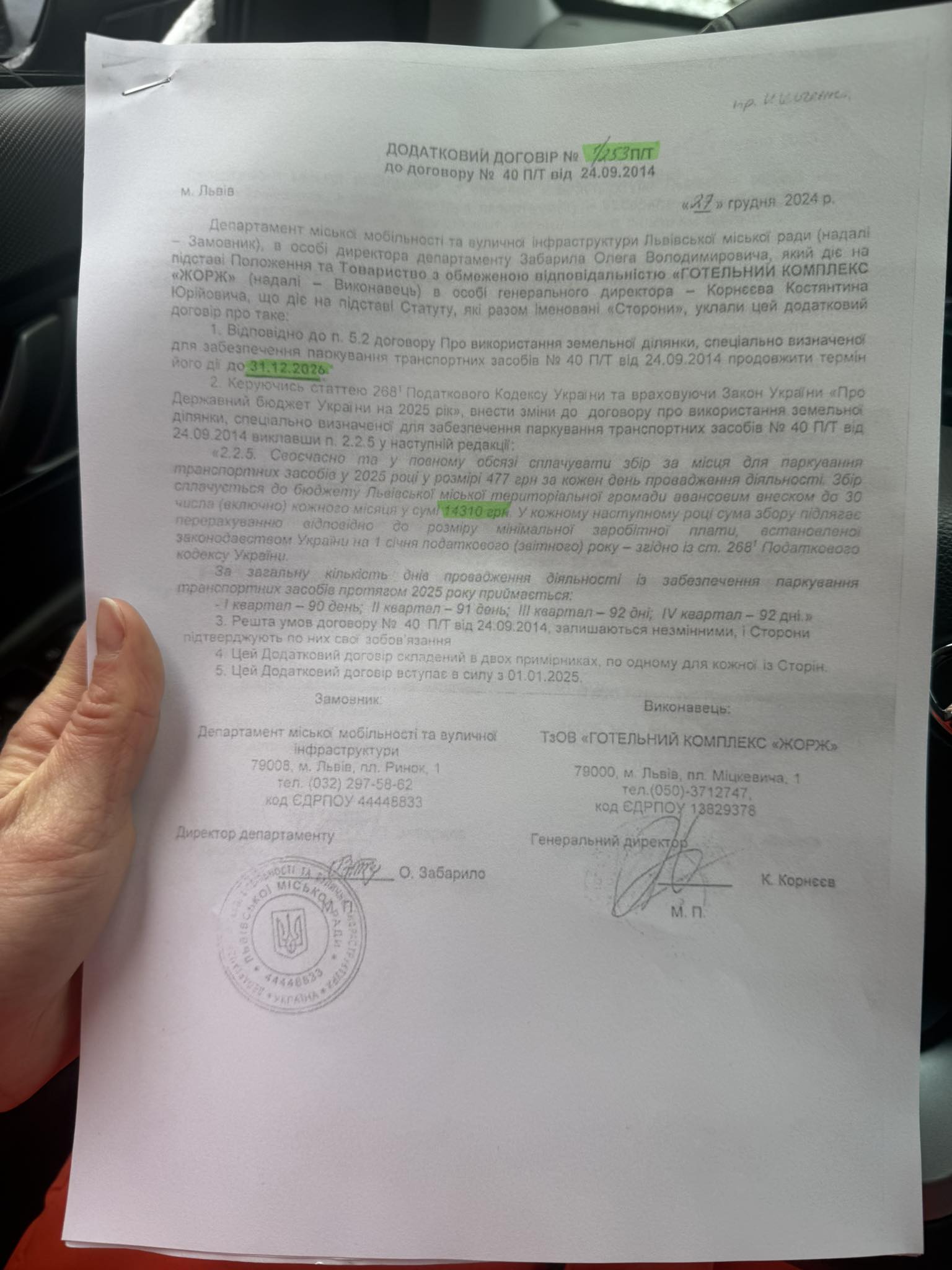 У вівторок, 10 лютого, журналістка Діана Луцишин опублікувала в соцмережах допис про те, що працівник готелю “Жорж”, який розташований у центрі Львова, заборонив їй паркуватися на стоянці поблизу готелю. В аргументацію він наводив договір за яким нібито ці паркомісця готель орендує у міськради для своїх потреб. Однак документ виявився підробленим. “Приніс, а договір дійсний від початку і до кінця 2025 року - до 31.12.2025… Працівник почав запевняти, що є новий договір, просто ще не встигли роздрукувати… І тут мені приносять його! Той самий договір, з тим самим номером, датами і умовами, навіть з підписом Олега Забарила, але бляха з фотошопленою (ше й косо-криво) останньою цифрою, ніби-то він дійсний до кінця 2026”, — йдеться в дописі журналістки. Під дописом Діани Луцишин залишив коментар сам директор департаменту міської мобільності та вуличної інфраструктури ЛМР Олег Забарило. Він зазначив, що договір між готелем та міською радою на користування майданчиком для гостьового паркування дійсно був чинним до кінця 2025 року. “Станом на сьогодні чинного договору немає. Питання укладення договору на 2026 рік перебуває на розгляді в підрозділах Львівської міської ради. Відповідно жодних підстав обмежувати паркування автомобілів на цій ділянці ніхто не має права”, — прокоментував Олег Забарило. Позиція готелю Після інциденту у самому готелі зазначили, що ці місця є громадськими. “Загалом це громадські паркомісця, тобто будь-хто там може припаркуватися. Іноді в нас охоронець може поставити фішку, якщо умовно у нас гості. Але якщо хтось хоче тут припаркуватись, то ми цю фішку можемо забрати”, — зазначила конференц-менеджерка Марія у коментарі для LVIV.MEDIA. До слова, готель “Жорж" розташований на площі Міцкевича, 1. Готель належить ТзОВ “Готельний комплекс “Жорж”, власницею якого є Ольга Філатова-Кривецька, дружина відомого львівського бізнесмена та політика Ігоря Кривецького.