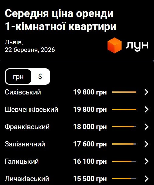 У Львові залишається високим попит на оренду. За останні пів року вартість однокімнатних квартир зросла на 12%, а на трикімнатні — дещо знизилась. Про це йдеться у аналітиці ЛУН станом на 22 березня. Вартість оренди однокімнатних квартир у Львові Середня вартість оренди однокімнатних квартир у Львові становить близько 18 000 гривень на місяць. Найвищі ціни фіксують у Сихівському та Шевченківському районах — у середньому 19 800 гривень. Винайняти житло у Франківському районі вартує дещо дешевше — близько 18 000 гривень, а у Залізничному районі — 17 700 гривень. Найдоступніші варіанти пропонують у Галицькому районі — близько 16 100 гривень, та у Личаківському — приблизно 15 500 гривень. Де орендувати двокімнатне житло у Львові Щодо двокімнатних квартир, то середня ціна оренди — 20 000 гривень. Найвищі ціни у Шевченківському районі — у середньому 24 200 гривень на місяць. У Личаківському районі оренда становить близько 21 500 гривень, а у Галицькому — 22 000 гривень. У Франківському районі приблизно 20 000 гривень, у Залізничному — 19 800 гривень. Найдешевше двокімнатне житло можна знайти у Сихівському районі — у середньому 18 000 гривень. Що з цінами на трикімнатні квартири Середня вартість оренди трикімнатної квартири у Львові наразі становить 27 000 гривень. Повноцінної статистики щодо такого типу квартир наразі немає. Як змінилися ціни за рік Оренда однокімнатних квартир за рік зросла приблизно на 7%, а на двокімнатне житло ціни майже не змінилися. Щодо трикімнатних квартир, то за рік оренда подорожчала майже на 17%.