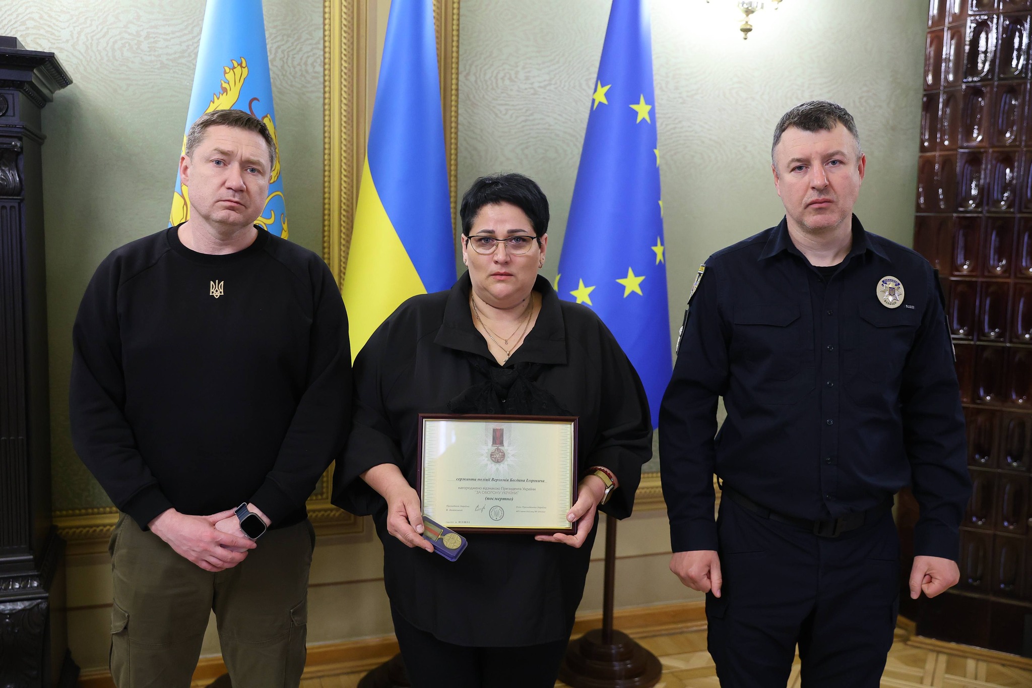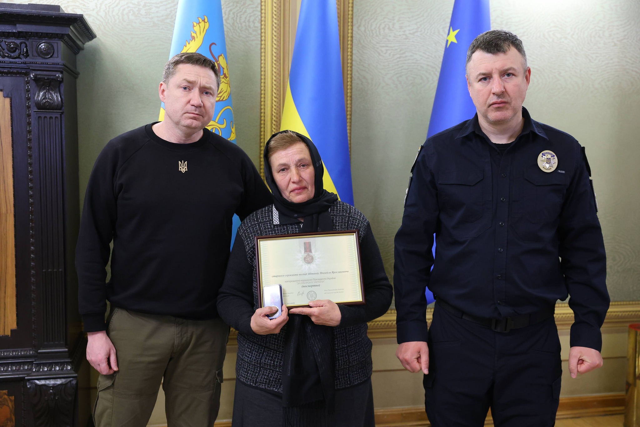 У середу, 1 квітня, у Львові відзначили родини двох поліцейських, які загинули, захищаючи Україну. Відзнаки Президента України «За оборону України» вручали голова Львівської ОВА Максим Козицький та начальник Головного управління Нацполіції Львівщини Олександр Шляховський. Капрал поліції Богдан Верхомій, 29 років, львів’янин У травні 2025 року поблизу села Плещиївка на Донеччині під час контрдиверсійних заходів Богдан отримав поранення і перестав виходити на зв’язок. У вересні того ж року його визнали загиблим. Відзнаку Герою передали його мамі — Галині Верхомій. Старший сержант поліції Михайло Штинда, 38 років, мешканець Дрогобича У вересні 2025 року під час евакуації поблизу села Іванопілля на Донеччині Михайло потрапив під удар ворожих FPV-дронів і загинув. Відзнаку передали його мамі — Ганні Штинді. Нагадаємо, раніше патрульного з Львівщини Василя Гринчишина посмертно нагородили орденом "За мужність" III ступеня. Воїн загинув на Донеччині від артилерійського обстрілу.
