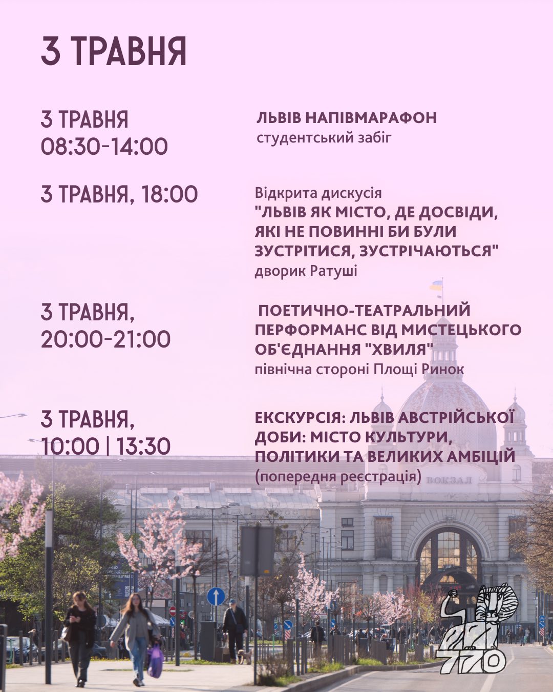У Львові наступного тижня відзначатимуть 770-річчя міста. Гучних святкувань не планують, однак відбудеться низка тематичних подій, серез яких виставки, лекції, спортивні заходи і концерти. Про це повідомили у Львівській міській раді 24 квітня. З нагоди Дня міста відбудеться збір для Збройних Сил, який організовує Фонд “Повернись живим” спільно з львівською молодіжною організацією “Твори”. “Кожна подія — це не лише привід зібратися разом, а й можливість подякувати нашим військовим і підтримати їх. Тому спільно з благодійними партнерами ми розпочинаємо збір 7,7 мільйона гривень на закупівлю наземних роботизованих комплексів для військових”, — зазначила директорка офісу молодіжної столиці Європи Львівської міської ради Тетяна Кожокарь. День міста-2026 у Львові: програма 24 квітня Святкові події стартують 24 квітня з відкриття виставки Павла Макова “Абракадабра” у Національному музеї імені Андрея Шептицького. Експозиція триватиме до 7 червня та представить цикл робіт, над яким митець працював понад десять років. 26 квітня 26 квітня у місті відбудуться заходи, присвячені Грицьку Чубаю. Зокрема, з 14:30 до 16:00 запланована екскурсія вулицею, названою на його честь, від дослідниці архітектури модернізму Мирослави Ляхович (початок — вул. Чубая, 1). Вулицю на честь українського поета Грицька Чубая, якого називають “батьком львівського андеґраунду”, назвали у Львові в рамках деколонізації у 2022 році. Раніше це була вулиця Академіка Павлова. О 16:00–17:00 у просторі Мистецької бібліотеки, що на вул. Шота Руставелі, 8, пройде розмова про Грицька Чубая з письменником і публіцистом Миколою Рябчуком. Для участі в події (в обох частинах чи в одній) потрібно зареєструватися. 29 квітня 29 квітня, о 14:00–15:30, — у межах проєкту “Вулиці Імен” відбудеться екскурсія вулицею Івана Вакарчука від історикині архітектури Тетяни Казанцевої (старт — перетин вулиць Матейка та Вакарчука, біля входу до парку Франка). О 15:30–16:30 — розмова про науковця зі Святославом Вакарчуком у Науковій бібліотеці ЛНУ ім. І. Франка, що на вул. Драгоманова, 5. Щоб відвідати подію (повністю чи одну із них), потрібно зареєструватися. 1 травня О 14:00 на площі Ринок, 1 відбудеться церемонія нагородження відзнакою «Почесний знак Святого Юрія» (посмертно) львівських Захисників та Захисниць України. До Дня міста у Львові у п'ятницю презентують та погасять спеціальну поштову марку. О 13:00 та 16:00 —екскурсія «Кастелівка: місто-сад і архітектура ідей». Подія присвячена урбаністичному експерименту району Кастелівка. Гідеса — Олена Дворкіна. Реєстрація за телефоном 063 260 57 76. Також у програмі на львів'ян та гостей міста чекатиме музичний сюрприз — концерт гурту зі Львова «Один в каное». З міркувань безпеки про час і локацію буде проанонсовано додатково. 2 травня 10:00–13:00 — екскурсія “Львів, який потрібно читати: символи, деталі і тиша Личаківського передмістя”. Ця екскурсія пропонує інший погляд на Львів. Не через найвідоміші пам’ятки, а через сенси, символи та деталі, які формують глибше розуміння міста. Зареєструватися на подію можна на сайті lviv.travel з 27 квітня. 12:00–18:00 — заходи для всієї сім'ї “Простір 770 зустрічей”. На площі перед Львівським національним університетом імені Івана Франка для дітей і дорослих підготують насичену програму: майстер-класи, зокрема з архітектурного напряму, аквагрим, а також