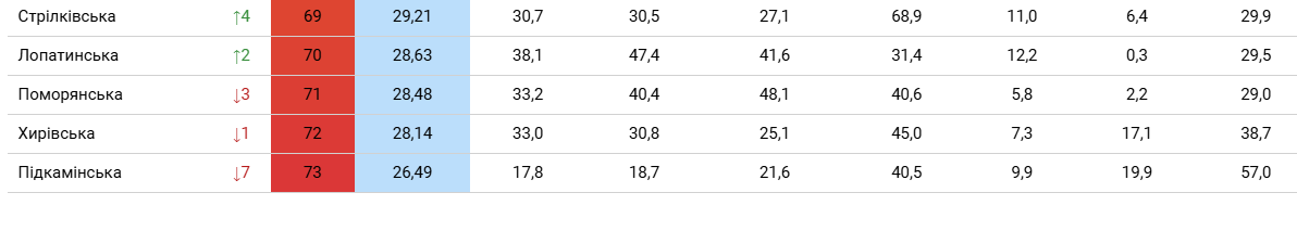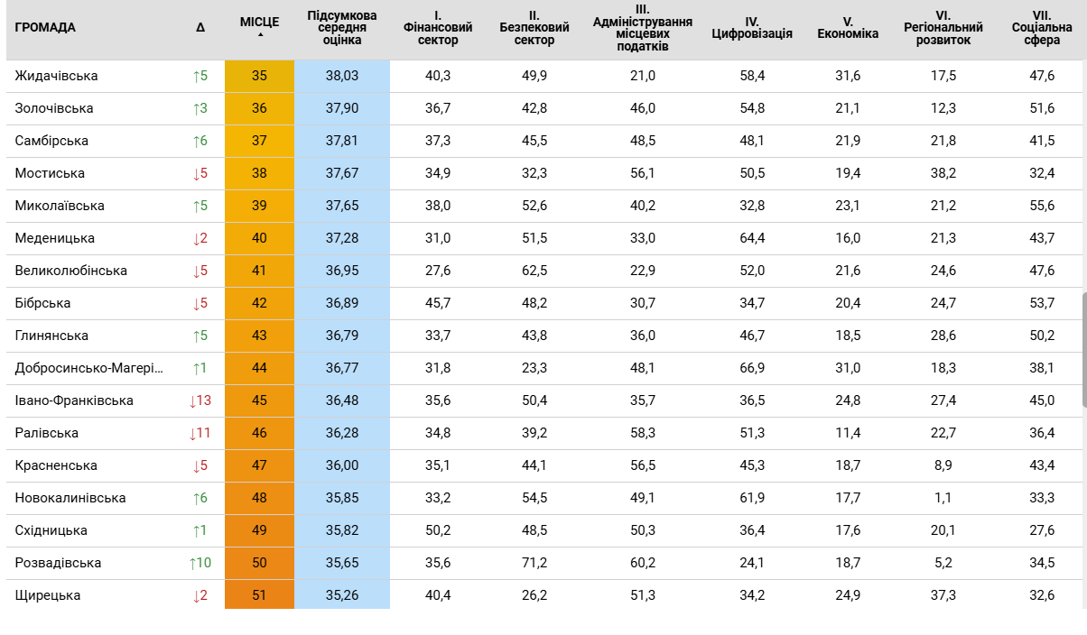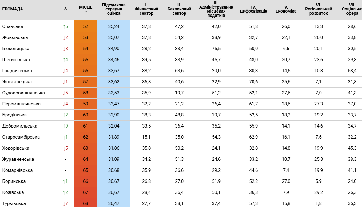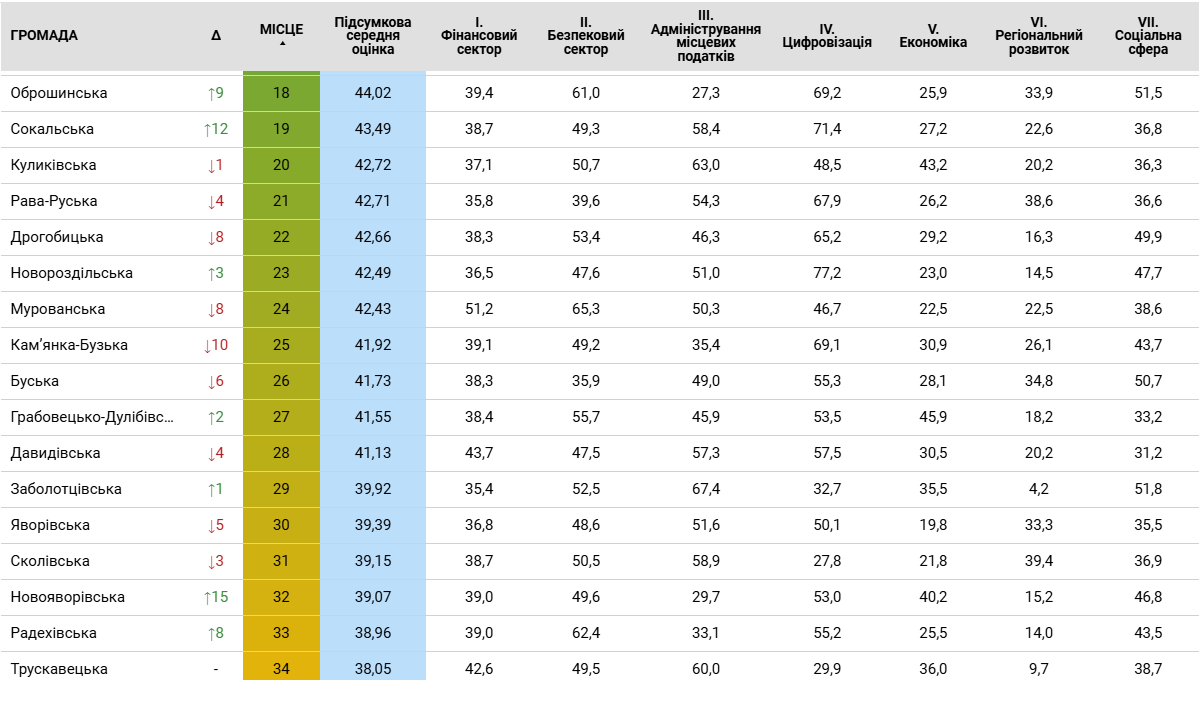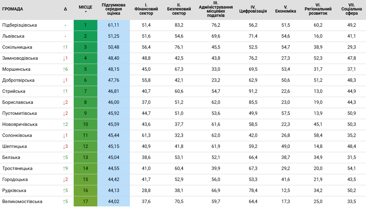На Львівщині сформували оновлений рейтинг територіальних громад за підсумками вересня. Про це повідомив начальник Львівської ОВА Максим Козицький у понеділок, 29 вересня. До переліку вперше увійшла Новояричівська громада. Десятка лідерів серед громад Львівщини До десятки найсильніших увійшли: Підберізцівська Львівська Сокільницька Зимноводівська Моршинська Добротвірська Стрийська Бориславська Пустомитівська Новояричівська Новояричівська громада вперше у ТОП-10 Підберізцівська та Львівська громади традиційно утримують лідерські позиції. Водночас уперше у рейтинг громад увійшла Новояричівська громада, яка показала позитивну динаміку в кількох напрямах. Зокрема, оновила нормативну грошову оцінку земель, впровадила стимули для активної сплати податків, затвердила стратегічні документи з урахуванням рекомендацій Мінрегіону та налагодила їхній моніторинг. Громада також активно подає проєкти в систему DREAM, завершує верифікацію адрес у ЄДРА, облаштувала житло для більш ніж половини зареєстрованих внутрішньо переміщених осіб і створила простори підтриманого проживання для людей з інвалідністю. Де ознайомитися з детальним рейтингом? Рейтингове оцінювання громад у Львівській ОВА проводять щомісяця за 7 блоками та 42 критеріями. Вони показують результати роботи: від наповнення бюджетів до ефективного використання ресурсів, впровадження соціальних ініціатив та готовність реагувати на виклики війни. “Для очільників громад це об’єктивний показник результатів, для жителів — зрозуміле відображення змін і того, що ще треба розвивати”, — зазначив Максим Козицький. Ознайомитися з детальними результатами рейтингу та динамікою кожної громади можна за посиланням. Нагадаємо, віднедавна можна дивитися результати не лише загалом, а й у своїй категорії: великі громади (35 тисяч населення та більше) середні громади (15–35 тисяч населення) малі громади (до 15 тисяч населення) Так мешканці кожної громади можуть побачити свою громаду серед рівних за розміром.