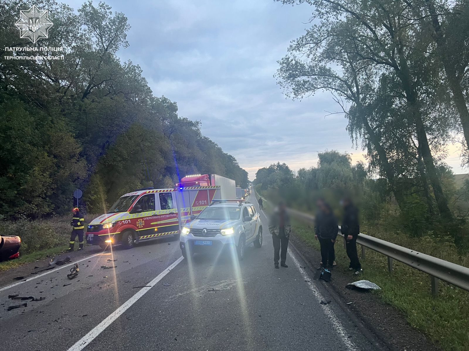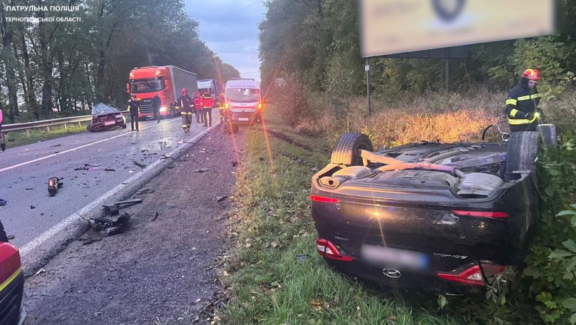 Увечері четверга, 2 жовтня, на трасі «Тернопіль — Львів — Рава-Руська» поблизу села Озерна сталася ДТП між двома легковими автомобілями. Унаслідок аварії один із автомобілів перекинувся — є потерпілі. Рух на ділянці ускладнений. Про це повідомили у патрульній поліції Тернопільської області. Рух ускладнено Про аварію патрульна поліція повідомила близько 21:00. На опублікованих фото видно, що одне з авто внаслідок удару перекинулося в кювет і опинилося на даху. Інша машина теж зазнала значних пошкоджень — передня частина повністю зім’ята. Також на фото видно, що десятки автомобілів не могли проїхати через заблоковану ділянку. На місці працюють медики, рятувальники та поліцейські. Рух на цій ділянці магістралі частково ускладнений — патрульні організували реверсний проїзд і просять водіїв бути уважними.