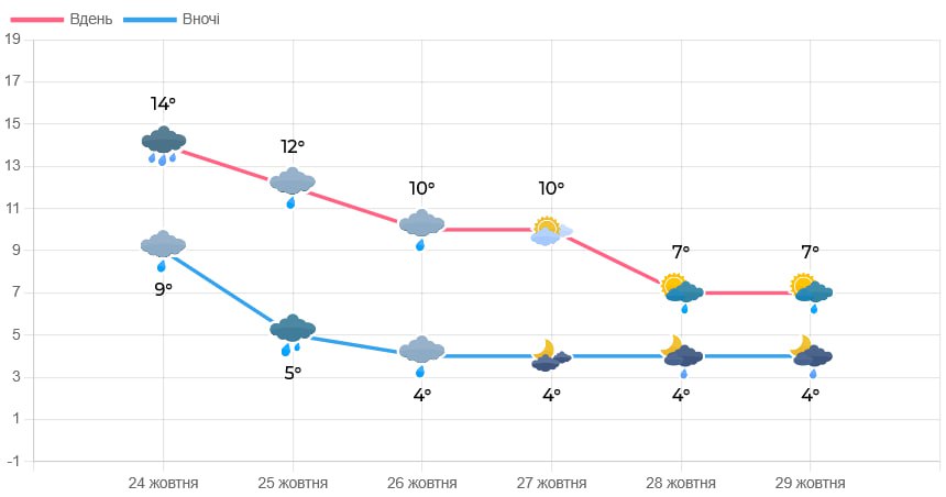 У Львові та на території області в суботу, 25 жовтня, очікується хмарна погода з проясненнями. Вночі та вранці можливі дощі, а в горах – мокрий сніг. Вдень опадів не передбачається. Про це повідомили у Львівському регіональному центрі з гідрометеорології. Погода у Львові На дорогах: вночі та вранці можливі дощі Вітер: західний, 9–14 м/с, пориви 15–20 м/с Температура повітря: Погода в області На дорогах: дощ, в горах можливий мокрий сніг Вітер: західний, 9–14 м/с, пориви 15–20 м/с Температура повітря: Синоптики попереджають про можливі пориви вітру до 20 м/с, що може створювати небезпеку для руху транспорту. Водіям радять бути обережними, особливо в гірських районах. Вихідні на Львівщині будуть хмарними з проясненнями. Очікуються невеликі дощі, а температура повітря поступово знижуватиметься.