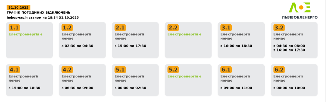 На Львівщині у п’ятницю, 31 жовтня, діятимуть графіки відключень електроенергії. Світло вимикатимуть протягом всієї доби. Про це повідомили у Львівобленерго. Актуальний графік Актуальний графік станом на 10:47, 31 жовтня. Споживачі групи 1.1 не матимуть світла з 14:00 до 15:30 Споживачі групи 1.2 не матимуть світла з 02:30 до 04:30 та з 16:00 до 18:00 Споживачі групи 2.1 не матимуть світла з 14:00 до 18:30 та з 22:00 до 00:00 Споживачі групи 2.2 не матимуть світла з 22:00 до 00:00 Споживачі групи 3.1 не матимуть світла з 15:00 до 18:00 Споживачі групи 3.2 не матимуть світла з 04:30 до 08:00 та з 16:00 до 18:00 Споживачі групи 4.1 не матимуть світла з 14:00 до 18:30 Споживачі групи 4.2 не матимуть світла з 06:30 до 09:00 та з 16:00 до 18:00 Споживачі групи 5.1 не матимуть світла з 00:00 до 02:30 та з 18:00 до 22:00 Споживачі групи 5.2 не матимуть світла з 18:00 до 22:00 Споживачі групи 6.1 не матимуть світла з 09:00 до 11:30 та з 18:30 до 22:00 Споживачі групи 6.2 не матимуть світла з 08:00 до 10:00 та з 18:30 до 22:00 Згодом у “Львівобленерго” повідомили, що станом на 17:35 графік погодинних відключень світла змінився і в одній з груп відмінили відключення електроенергії Станом на 18:34 відключення скасували для ще двох груп споживачів. Як дізнатись свою чергу відключень До слова, дізнатись свою чергу аварійних чи погодинних відключень можна: на сайті “Львівобленерго” у розділі «Чому немає світла»: https://poweron.loe.lviv.ua/ У чат-ботах: “Львівобленерго” у Viber (для побутових споживачів): https://www.viber.com/loebot “Львівобленерго” у Telegram (для побутових споживачів): https://t.me/loeserviceBot “Львівобленерго Бізнес” у Viber (для юридичних споживачів): www.viber.com/loebiznesbot “Львівобленерго Бізнес” у Telegram (для юридичних споживачів): https://t.me/loebiznesbot у мобільному застосунку КомКом: https://loe.lviv.ua/page/komkom-app