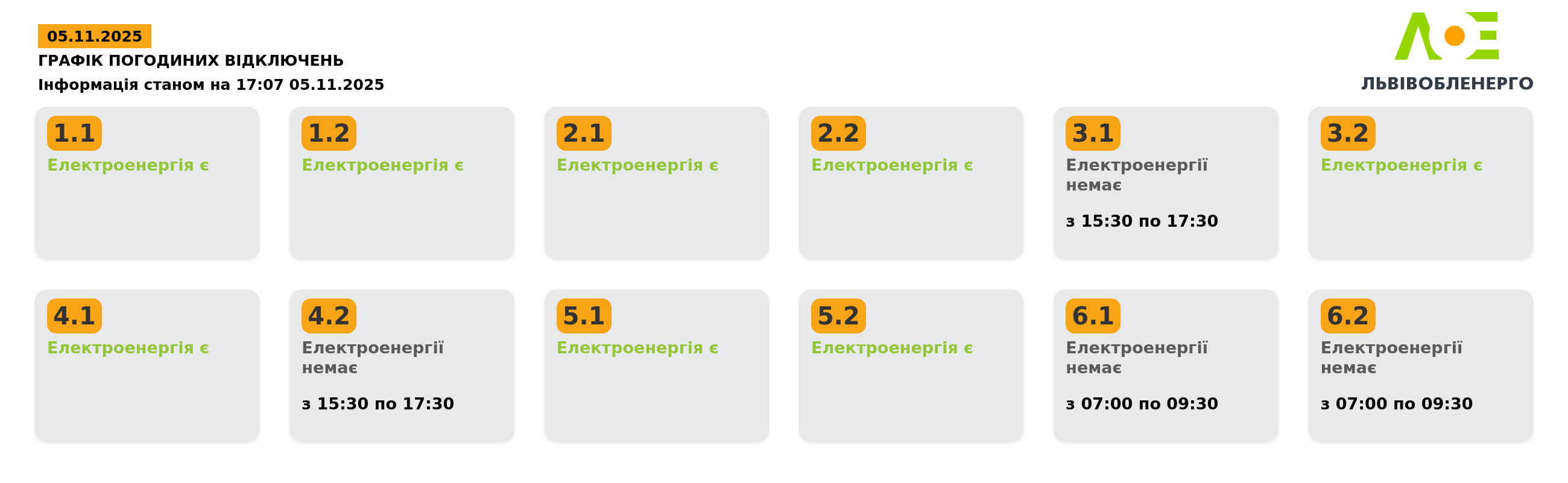 На Львівщині у середу, 5 листопада, діятимуть графіки відключень електроенергії. Про це повідомили у Львівобленерго. Оновлено: Вранці 5 листопада Львівобленерго скасувало графіки відключень світла, однак уже о 15:27 відключення для декількох груп повернули. Актуальний графік Споживачі групи 1.1 матимуть світло Споживачі групи 1.2 матимуть світло Споживачі групи 2.1 матимуть світло Споживачі групи 2.2 матимуть світло Споживачі групи 3.1 не матимуть світла з 15:30 до 17:30 Споживачі групи 3.2 матимуть світло Споживачі групи 4.1 матимуть світло Споживачі групи 4.2 не матимуть світла з 15:30 до 17:30 Споживачі групи 5.1 матимуть світло Споживачі групи 5.2 матимуть світло Споживачі групи 6.1 не матимуть світла з 07:00 до 09:30 Споживачі групи 6.2 не матимуть світла з 07:00 до 09:30 Як дізнатись свою чергу відключень До слова, дізнатись свою чергу аварійних чи погодинних відключень можна: на сайті “Львівобленерго” у розділі «Чому немає світла»: https://poweron.loe.lviv.ua/ У чат-ботах: “Львівобленерго” у Viber (для побутових споживачів): https://www.viber.com/loebot “Львівобленерго” у Telegram (для побутових споживачів): https://t.me/loeserviceBot “Львівобленерго Бізнес” у Viber (для юридичних споживачів): www.viber.com/loebiznesbot “Львівобленерго Бізнес” у Telegram (для юридичних споживачів): https://t.me/loebiznesbot у мобільному застосунку КомКом: https://loe.lviv.ua/page/komkom-app