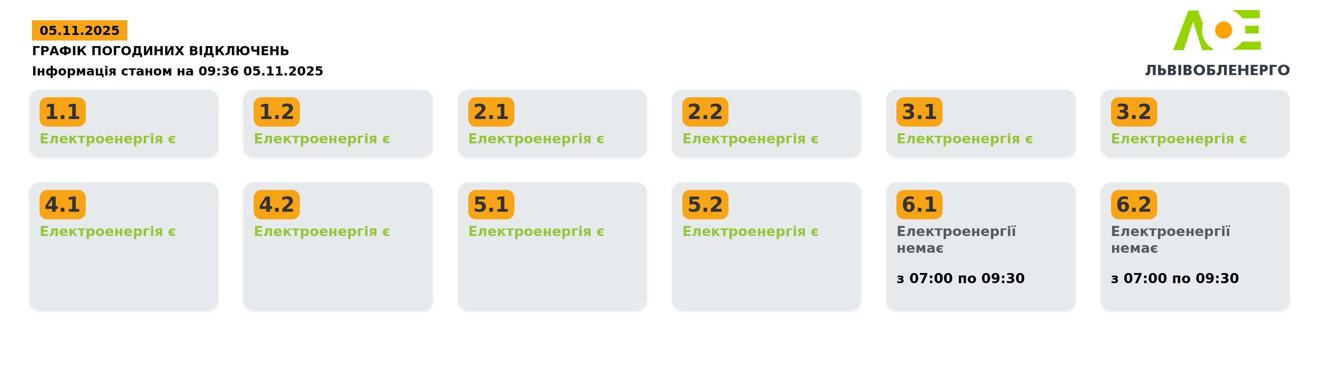 Львівобленерго скасувало графіки відключень світла на 5 листопада. Світло вимикали лише двом групам вранці. Про це повідомили на сайті Львівобленерго. Світло протягом дня буде у всіх груп Станом на 09:36 світло буде протягом дня у всіх груп. Група 1.1. Електроенергія є. Група 1.2. Електроенергія є. Група 2.1. Електроенергія є. Група 2.2. Електроенергія є. Група 3.1. Електроенергія є. Група 3.2. Електроенергія є. Група 4.1. Електроенергія є. Група 4.2. Електроенергія є. Група 5.1. Електроенергія є. Група 5.2. Електроенергія є. Група 6.1. Електроенергії немає з 07:00 до 09:30. Група 6.2. Електроенергії немає з 07:00 до 09:30. Нагадаємо, напередодні Львівобленерго оприлюднювало графік погодинних відключень електроенергії, за яким світло мали вимикати споживачам усіх груп. Як дізнатись свою чергу відключень До слова, дізнатись свою чергу аварійних чи погодинних відключень можна: на сайті “Львівобленерго” у розділі «Чому немає світла»: https://poweron.loe.lviv.ua/ У чат-ботах: “Львівобленерго” у Viber (для побутових споживачів): https://www.viber.com/loebot “Львівобленерго” у Telegram (для побутових споживачів): https://t.me/loeserviceBot “Львівобленерго Бізнес” у Viber (для юридичних споживачів): www.viber.com/loebiznesbot “Львівобленерго Бізнес” у Telegram (для юридичних споживачів): https://t.me/loebiznesbot у мобільному застосунку КомКом: https://loe.lviv.ua/page/komkom-app