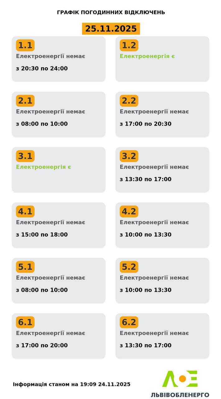 У вівторок, 25 листопада, у Львівській області знову діятимуть погодинні графіки відключень електроенергії. Про це повідомили у Львівобленерго. Актуальний графік Споживачі групи 1.1 не матимуть світло з 20:30 до 24:00 Споживачі групи 1.2 матимуть світло Споживачі групи 2.1 не матимуть світло з 08:00 до 10:00 Споживачі групи 2.2 не матимуть світло з 17:00 до 20:30 Споживачі групи 3.1 матимуть світло Споживачі групи 3.2 не матимуть світло з 13:30 до 17:00 Споживачі групи 4.1 не матимуть світло з 15:00 до 18:00 Споживачі групи 4.2 не матимуть світло з 10:00 до 13:30 Споживачі групи 5.1 не матимуть світло з 08:00 до 10:00 Споживачі групи 5.2 не матимуть світло з 10:00 до 13:30 Споживачі групи 6.1 не матимуть світло з 17:00 до 20:00 Споживачі групи 6.2 не матимуть світло з 13:30 до 17:00 Як дізнатись свою чергу відключень Дізнатись свою чергу аварійних чи погодинних відключень можна: на сайті “Львівобленерго” у розділі «Чому немає світла»: https://poweron.loe.lviv.ua/ У чат-ботах: “Львівобленерго” у Viber (для побутових споживачів): https://www.viber.com/loebot “Львівобленерго” у Telegram (для побутових споживачів): https://t.me/loeserviceBot “Львівобленерго Бізнес” у Viber (для юридичних споживачів): www.viber.com/loebiznesbot “Львівобленерго Бізнес” у Telegram (для юридичних споживачів): https://t.me/loebiznesbot у мобільному застосунку КомКом: https://loe.lviv.ua/page/komkom-app
