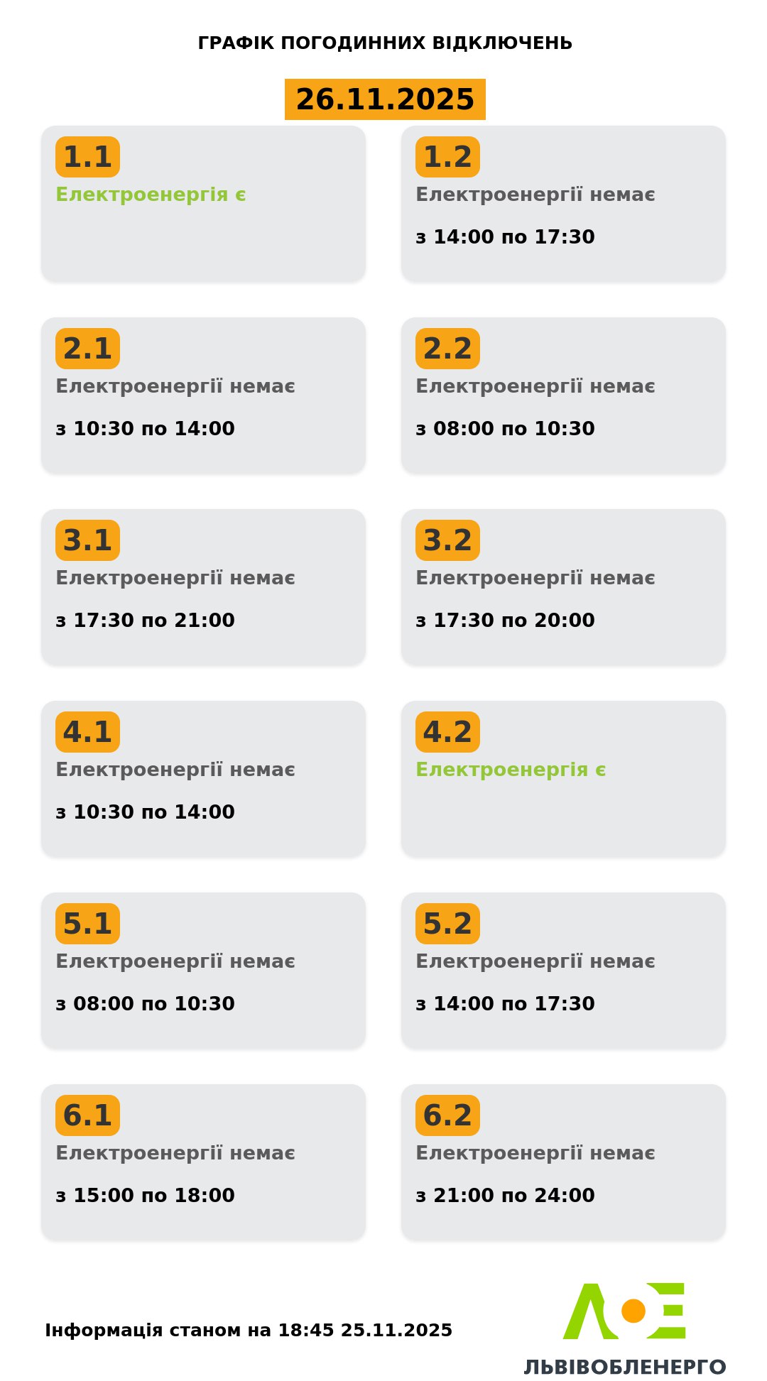 У середу, 26 листопада, у Львівській області знову діятимуть погодинні графіки відключень електроенергії. Про це повідомили у Львівобленерго. Актуальний графік Група 1.1. Електроенергія є. Група 1.2. Електроенергії немає з 14:00 до 17:30. Група 2.1. Електроенергії немає з 10:30 до 14:00. Група 2.2. Електроенергії немає з 08:00 до 10:30. Група 3.1. Електроенергії немає з 17:30 до 21:00. Група 3.2. Електроенергії немає з 17:30 до 20:00. Група 4.1. Електроенергії немає з 10:30 до 14:00. Група 4.2. Електроенергія є. Група 5.1. Електроенергії немає з 08:00 до 10:30. Група 5.2. Електроенергії немає з 14:00 до 17:30. Група 6.1. Електроенергії немає з 15:00 до 18:00. Група 6.2. Електроенергії немає з 21:00 до 24:00. Як дізнатись свою чергу відключень Дізнатись свою чергу аварійних чи погодинних відключень можна: на сайті “Львівобленерго” у розділі «Чому немає світла»: https://poweron.loe.lviv.ua/ У чат-ботах: “Львівобленерго” у Viber (для побутових споживачів): https://www.viber.com/loebot “Львівобленерго” у Telegram (для побутових споживачів): https://t.me/loeserviceBot “Львівобленерго Бізнес” у Viber (для юридичних споживачів): www.viber.com/loebiznesbot “Львівобленерго Бізнес” у Telegram (для юридичних споживачів): https://t.me/loebiznesbot у мобільному застосунку КомКом: https://loe.lviv.ua/page/komkom-app