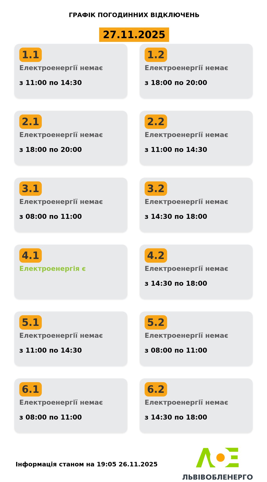 У четвер, 27 листопада, у Львівській області знову діятимуть погодинні графіки відключень електроенергії. Світло вимикатимуть для стабілізації енергосистеми після ворожих обстрілів. Про це повідомили у Львівобленерго. Актуальний графік Інформація станом на 19:05 26.11.2025 Група 1.1. Електроенергії немає з 11:00 до 14:30. Група 1.2. Електроенергії немає з 18:00 до 20:00. Група 2.1. Електроенергії немає з 18:00 до 20:00. Група 2.2. Електроенергії немає з 11:00 до 14:30. Група 3.1. Електроенергії немає з 08:00 до 11:00. Група 3.2. Електроенергії немає з 14:30 до 18:00. Група 4.1. Електроенергія є. Група 4.2. Електроенергії немає з 14:30 до 18:00. Група 5.1. Електроенергії немає з 11:00 до 14:30. Група 5.2. Електроенергії немає з 08:00 до 11:00. Група 6.1. Електроенергії немає з 08:00 до 11:00. Група 6.2. Електроенергії немає з 14:30 до 18:00. Як дізнатись свою чергу відключень До слова, дізнатись свою чергу аварійних чи погодинних відключень можна: на сайті “Львівобленерго” у розділі «Чому немає світла»: https://poweron.loe.lviv.ua/ У чат-ботах: “Львівобленерго” у Viber (для побутових споживачів): https://www.viber.com/loebot “Львівобленерго” у Telegram (для побутових споживачів): https://t.me/loeserviceBot “Львівобленерго Бізнес” у Viber (для юридичних споживачів): www.viber.com/loebiznesbot “Львівобленерго Бізнес” у Telegram (для юридичних споживачів): https://t.me/loebiznesbot у мобільному застосунку КомКом: https://loe.lviv.ua/page/komkom-app Нічна атака по Львівщині 19 листопада У ніч на 19 листопада російські військові атакували Львівщину ударними БпЛА та крилатими ракетами. За словами керівника Львівської ОВА Максима Козицького, за попередніми даними, обійшлося без жертв і потерпілих, однак є руйнування. Через обстріл постраждав енергооб’єкт, а також декілька підприємств. Пошкоджено деревообробне підприємство і складське приміщення, на одному з об’єктів рятувальники ліквідовували пожежу. Попри це, системи життєзабезпечення області працюють у штатному режимі, але для стабілізації енергосистеми й запровадили графіки відключень.