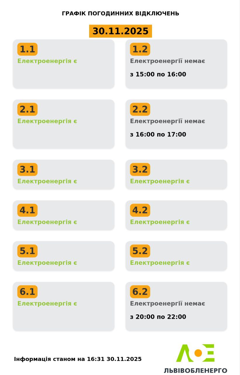 На Львівщині у неділю, 30 листопада, будуть діяти графіки відключень електроенергії. Світло вимикатимуть усім групам, окрім 5.1. Без електроенергії споживачі будуть до протягом дня. Про це повідомили у Львівобленерго. Актуальний графік Інформація станом на 16:31 30.11.2025 Група 1.1. Електроенергія є. Група 1.2. Електроенергії немає з 15:00 до 16:00. Група 2.1. Електроенергія є. Група 2.2. Електроенергії немає з 16:00 до 17:00. Група 3.1. Електроенергія є. Група 3.2. Електроенергія є. Група 4.1. Електроенергія є. Група 4.2. Електроенергія є. Група 5.1. Електроенергія є. Група 5.2. Електроенергія є. Група 6.1. Електроенергія є. Група 6.2. Електроенергії немає з 20:00 до 22:00. Як дізнатися свою групу відключень До слова, дізнатись свою чергу аварійних чи погодинних відключень можна: на сайті “Львівобленерго” у розділі «Чому немає світла»: https://poweron.loe.lviv.ua/ У чат-ботах: “Львівобленерго” у Viber (для побутових споживачів): https://www.viber.com/loebot “Львівобленерго” у Telegram (для побутових споживачів): https://t.me/loeserviceBot “Львівобленерго Бізнес” у Viber (для юридичних споживачів): www.viber.com/loebiznesbot “Львівобленерго Бізнес” у Telegram (для юридичних споживачів): https://t.me/loebiznesbot у мобільному застосунку КомКом: https://loe.lviv.ua/page/komkom-app
