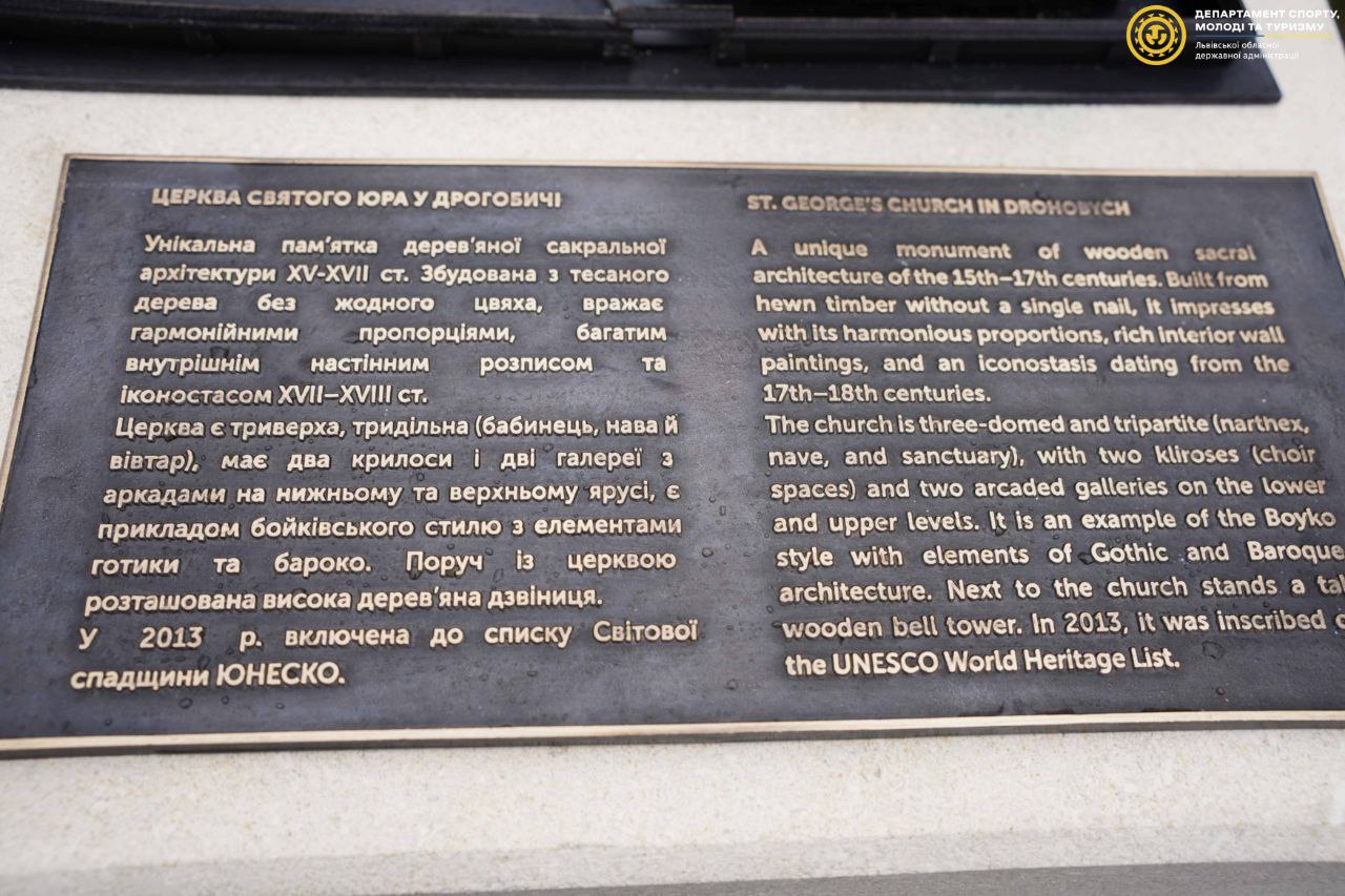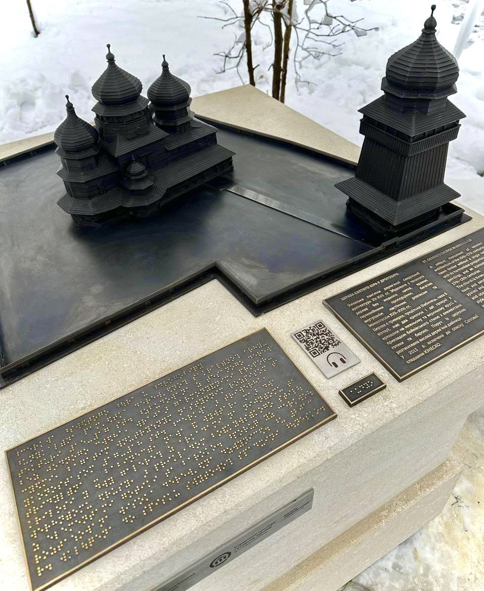У Дрогобичі встановили тактильний бронзовий макет церкви святого Юра — пам’ятки архітектури XV–XVI століть і частини Світової спадщини ЮНЕСКО. Макет створили, щоб люди з порушеннями зору могли “побачити” святиню на дотик і детально ознайомитися з її формою та архітектурою. Про це повідомили у Львівській обласній військовій адміністрації. Біля такутильної копії церкви встановили таблички написані шрифтом Брайля Церква святого Юра є однією з найдавніших і найкраще збережених дерев’яних споруд Львівщини. Бронзовий макет повністю повторює структуру комплексу — тридільної триверхої дерев’яної церкви та окремої дзвіниці. Автори проєкту намагалися максимально точно передати форму, пропорції й деталі автентичної будівлі. Поруч із макетом встановили металеві інформаційні таблички українською та англійською мовами, дубльовані шрифтом Брайля. “Наша мета – зробити Львівщину областю рівних можливостей для всіх. Маємо ще багато роботи. Продовжуємо”, — сказав начальник ЛОВА Максим Козицький. Також біля макету розмістили QR-код, за яким можна прослухати аудіоопис, що робить пам’ятку доступною для людей з порушенням зору. Фінансування На створення та встановлення макету спрямували понад 630 тисяч гривень: 400 тис. грн — кошти обласного бюджету; 236 тис. грн — фінансування Дрогобицької міської ради. Ідею та виконання тактильного макету реалізував скульптор Володимир Одрехівський.