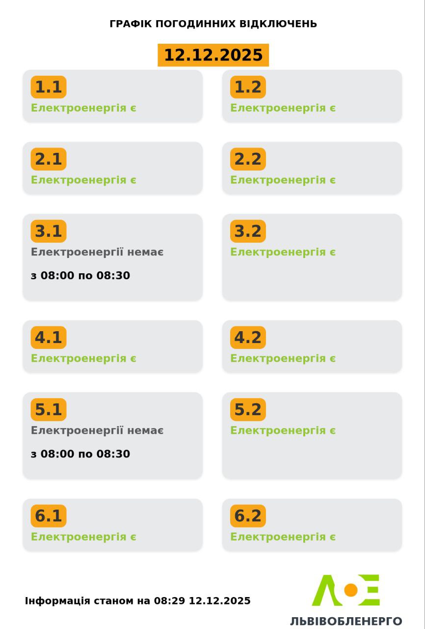 У п’ятницю, 12 грудня, у Львівській області знову діятимуть погодинні графіки відключень електроенергії. Світло вимикатимуть усім групам, крім 1.2, 3.2, 4.1 і 5.2. Про це повідомили у Львівобленерго. Актуальний графік Інформація станом на 08:29 12.12.2025 Група 1.1. Електроенергія є. Група 1.2. Електроенергія є. Група 2.1. Електроенергія є. Група 2.2. Електроенергія є. Група 3.1. Електроенергії немає з 08:00 до 08:30. Група 3.2. Електроенергія є. Група 4.1. Електроенергія є. Група 4.2. Електроенергія є. Група 5.1. Електроенергії немає з 08:00 до 08:30. Група 5.2. Електроенергія є. Група 6.1. Електроенергія є. Група 6.2. Електроенергія є. Як дізнатися свою групу відключень До слова, дізнатись свою чергу аварійних чи погодинних відключень можна: на сайті “Львівобленерго” у розділі «Чому немає світла»: https://poweron.loe.lviv.ua/ У чат-ботах: “Львівобленерго” у Viber (для побутових споживачів): https://www.viber.com/loebot “Львівобленерго” у Telegram (для побутових споживачів): https://t.me/loeserviceBot “Львівобленерго Бізнес” у Viber (для юридичних споживачів): www.viber.com/loebiznesbot “Львівобленерго Бізнес” у Telegram (для юридичних споживачів): https://t.me/loebiznesbot у мобільному застосунку КомКом: https://loe.lviv.ua/page/komkom-app