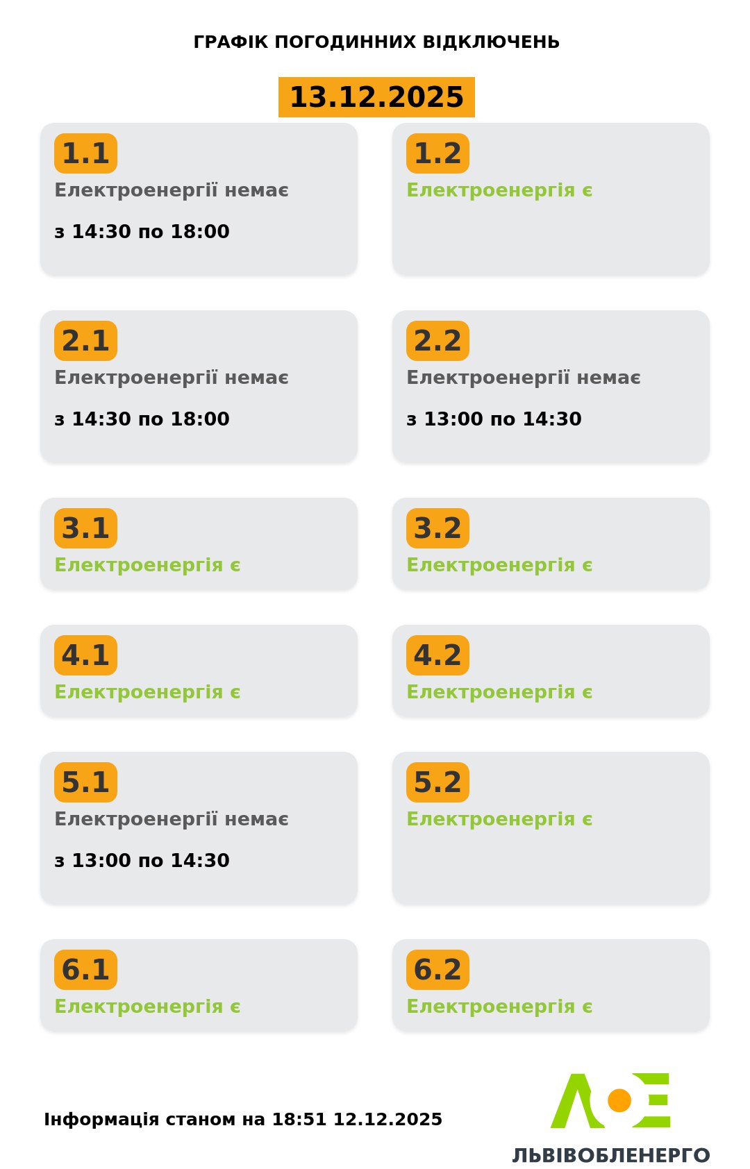 У суботу, 13 грудня, у Львівській області знову діятимуть погодинні графіки відключень електроенергії. Світло вимикатимуть лише групам 1.1, 2.1, 2.2 і 5.1. Про це повідомили у Львівобленерго. Актуальний графік Інформація станом на 18:51 12.12.2025 Група 1.1. Електроенергії немає з 14:30 до 18:00. Група 1.2. Електроенергія є. Група 2.1. Електроенергії немає з 14:30 до 18:00. Група 2.2. Електроенергії немає з 13:00 до 14:30. Група 3.1. Електроенергія є. Група 3.2. Електроенергія є. Група 4.1. Електроенергія є. Група 4.2. Електроенергія є. Група 5.1. Електроенергії немає з 13:00 до 14:30. Група 5.2. Електроенергія є. Група 6.1. Електроенергія є. Група 6.2. Електроенергія є. Як дізнатися свою групу відключень До слова, дізнатись свою чергу аварійних чи погодинних відключень можна: на сайті “Львівобленерго” у розділі «Чому немає світла»: https://poweron.loe.lviv.ua/ У чат-ботах: “Львівобленерго” у Viber (для побутових споживачів): https://www.viber.com/loebot “Львівобленерго” у Telegram (для побутових споживачів): https://t.me/loeserviceBot “Львівобленерго Бізнес” у Viber (для юридичних споживачів): www.viber.com/loebiznesbot “Львівобленерго Бізнес” у Telegram (для юридичних споживачів): https://t.me/loebiznesbot у мобільному застосунку КомКом: https://loe.lviv.ua/page/komkom-app