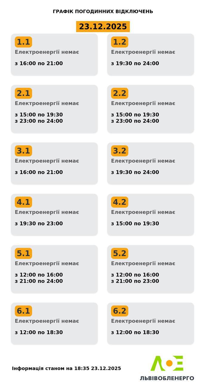 У Львові та області з 23 грудня діють графіки відключень світла. Згідно з новим графіком, відключення електроенергії триватимуть до 8 годин на добу, залежно від групи. Про це повідомили у Львівобленерго. Причини відключень Нагадуємо, що ці відключення стали наслідком ранкової атаки безпілотників на енергооб'єкти у Львівській області. Аварійні графіки відключень були введені з 10:05. Пресслужба Львівобленерго підтвердила, що відключення можуть тривати на невизначений термін, зокрема, через ситуацію з електричною мережею та наявними пошкодженнями. Актуальний графік Інформація станом на 14:33 23.12.2025 Група 1.1. Електроенергії немає з 16:00 до 21:00. Група 1.2. Електроенергії немає з 19:30 до 24:00. Група 2.1. Електроенергії немає з 15:00 до 19:30, з 23:00 до 24:00. Група 2.2. Електроенергії немає з 15:00 до 19:30, з 23:00 до 24:00. Група 3.1. Електроенергії немає з 16:00 до 21:00. Група 3.2. Електроенергії немає з 19:30 до 24:00. Група 4.1. Електроенергії немає з 19:30 до 23:00. Група 4.2. Електроенергії немає з 15:00 до 19:30. Група 5.1. Електроенергії немає з 12:00 до 16:00, з 21:00 до 24:00. Група 5.2. Електроенергії немає з 12:00 до 16:00, з 21:00 до 23:00. Група 6.1. Електроенергії немає з 12:00 до 18:30 Група 6.2. Електроенергії немає з 12:00 до 18:30 Як дізнатися свою групу відключень До слова, дізнатись свою чергу аварійних чи погодинних відключень можна: на сайті “Львівобленерго” у розділі «Чому немає світла»: https://poweron.loe.lviv.ua/ У чат-ботах: “Львівобленерго” у Viber (для побутових споживачів): https://www.viber.com/loebot “Львівобленерго” у Telegram (для побутових споживачів): https://t.me/loeserviceBot “Львівобленерго Бізнес” у Viber (для юридичних споживачів): www.viber.com/loebiznesbot “Львівобленерго Бізнес” у Telegram (для юридичних споживачів): https://t.me/loebiznesbot у мобільному застосунку КомКом: https://loe.lviv.ua/page/komkom-app