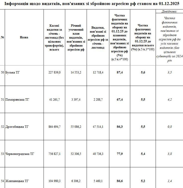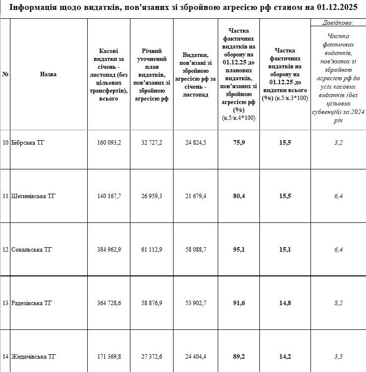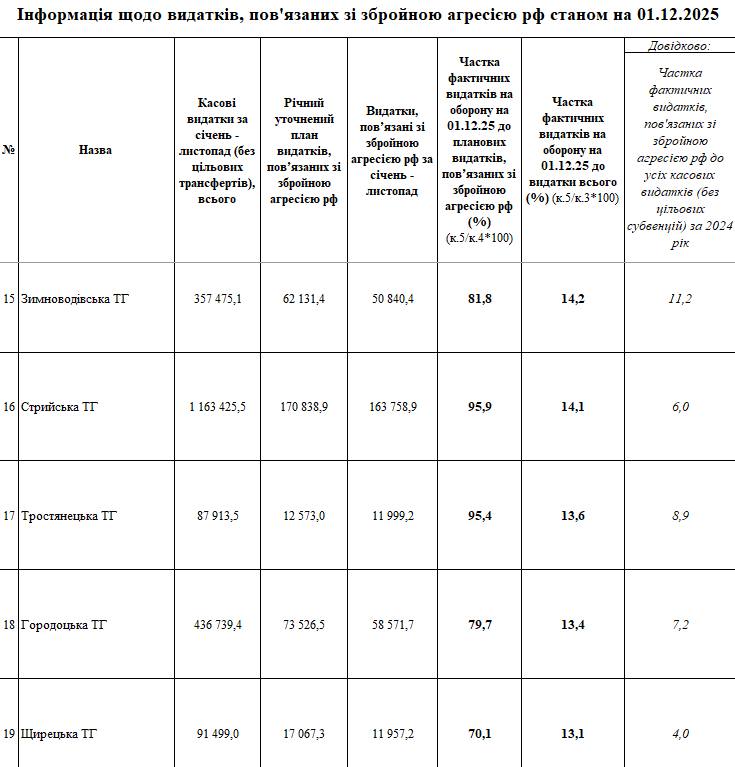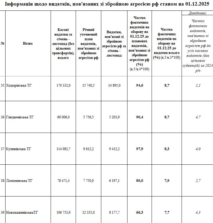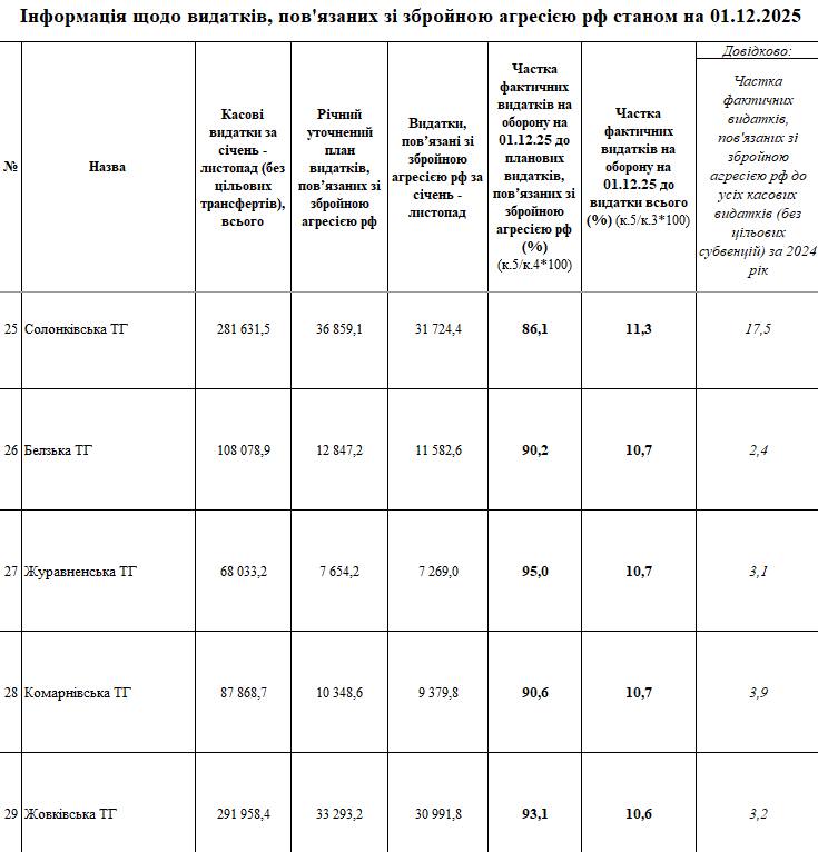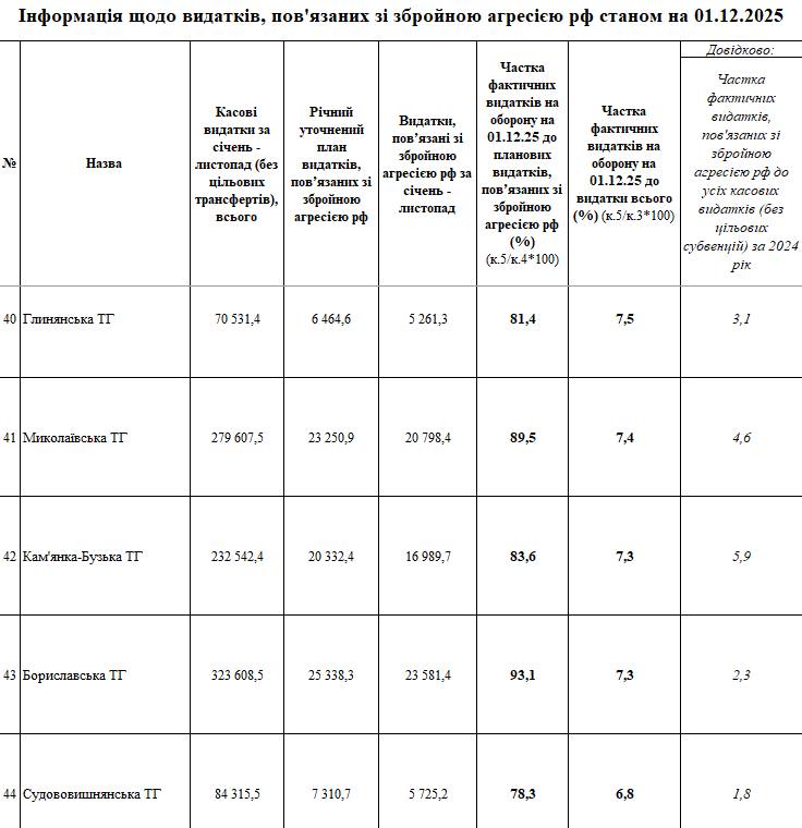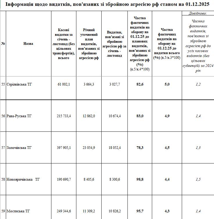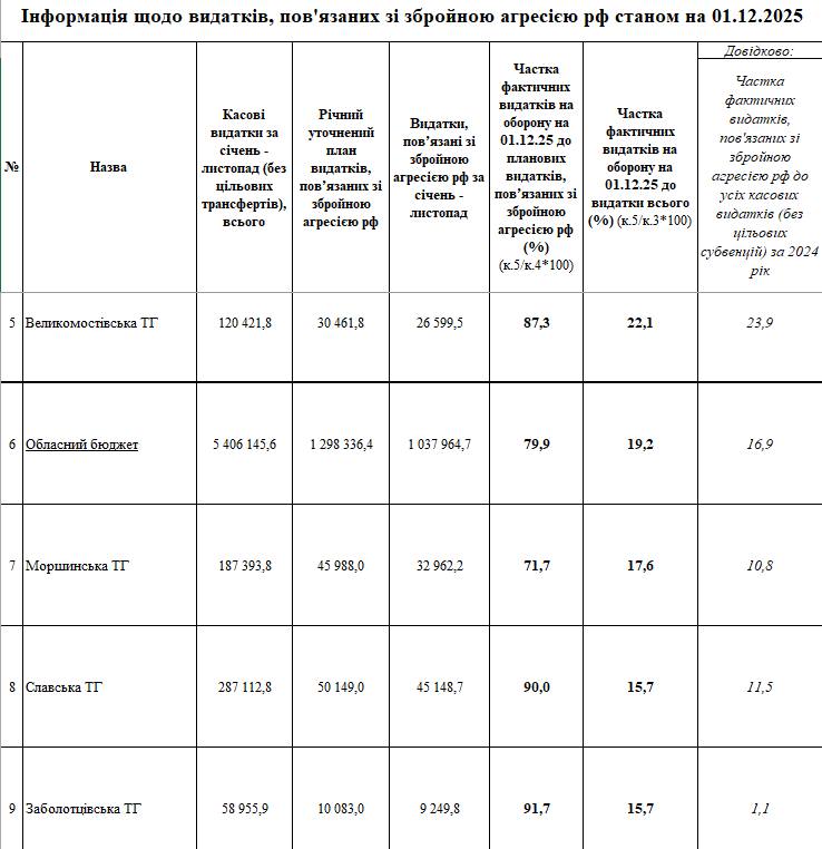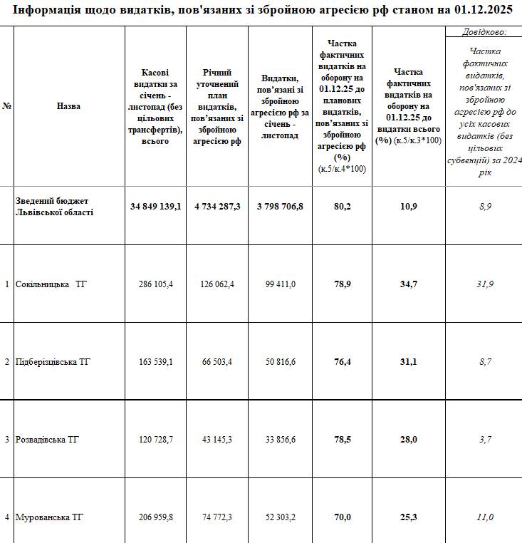 За 11 місяців 2025 року громади Львівщини спрямували понад 3,79 млрд грн на потреби, пов’язані зі збройною агресією Росії. Водночас частка оборонних видатків у місцевих бюджетах суттєво різниться: одні громади віддають на це понад 20–30%, тоді як 19 громад — менше ніж 5%. Про це 23 грудня повідомив очільник Львівщини Максим Козицький. Хто виділяє найбільше Найвищу частку видатків на оборону (у відсотках до загального бюджету без цільових трансфертів) уже кілька місяців мають такі громади: Сокільницька — 34,7% Підберізцівська — 31,1% Розвадівська — 28% Мурованська — 25,3% Великомостівська — 22,1% Окремо відзначають Сокільницьку та Великомостівську громади: вони вже два роки поспіль системно закладають значні суми на оборонні потреби. Де показники критично низькі Водночас у частини громад частка видатків на оборону стабільно залишається дуже малою: Добросинсько-Магерівська — 2,6% Самбірська — 1,5% Підкамінська — 1,1% Турківська — 2% Хирівська — 2,5% Загалом 19 громад Львівської області спрямували на оборону менше ніж 5% своїх бюджетів. Львівська громада виділила лише 9% від свого бюджету Окрім цього, Максим Козицький зазначив, що Львівська громада виділила на оборонні потреби лише 9% від загального бюджету — понад 1,2 млрд грн. “Окремого аналізу потребує Львівська громада, яка формує близько 38% усіх місцевих бюджетів Львівщини. Станом на 1 грудня вона виділила на оборонні потреби понад 1,2 млрд грн, що становить лише 9% від загального бюджету. Вкрай непропорційне рішення для громади такого масштабу”, — зазначив Максим Козицький. Чому це важливо За словами очільника Львівщини, підхід громад до фінансування оборони суттєво відрізняється: для одних це стало системною частиною бюджетної політики, тоді як інші залишають ці витрати «на другому плані». Максим Козицький наголосив, що низькі показники у 1–3% свідчать не про брак ресурсу, а про небажання переглядати пріоритети в умовах повномасштабної війни. “Шановні жителі Львівщини, місцевий бюджет – це ваші податки і ваша безпека. Ви маєте право й обов’язок знати, на що йдуть кошти громади в умовах війни. Запитуйте. Аналізуйте. Вимагайте пояснень. Це нормальна громадянська позиція у країні, яка воює за своє майбутнє. Мовчання – теж позиція. Але воно не захистить під час реальної загрози”, — додав Максим Козицький. Він також звернувся до керівників громад із закликом переоцінити бюджетні рішення, адже «кожен відсоток бюджету — це управлінська позиція».
