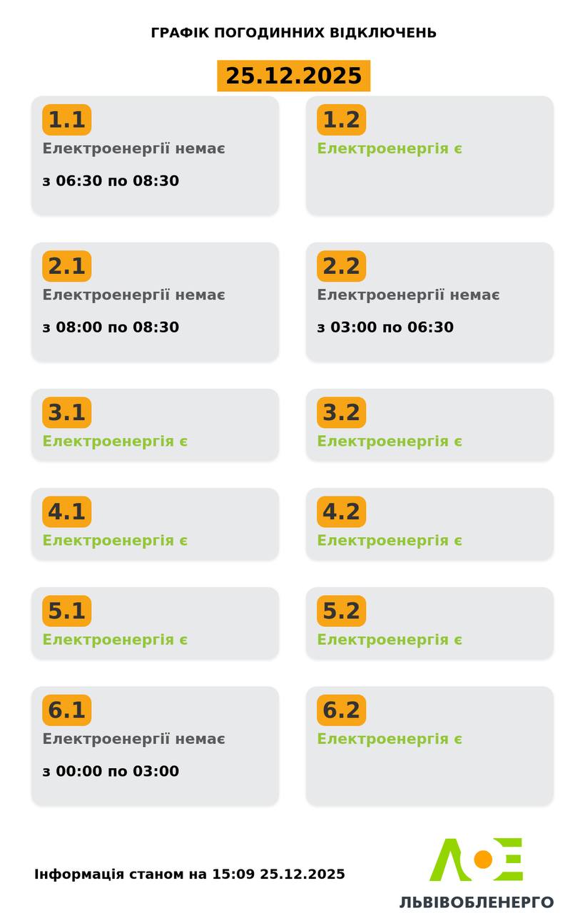 На Львівщині у четвер, 25 грудня, будуть діяти графіки відключень електроенергії. Світло вимикатимуть усім, окрім групи 5.2, 4.1 та 3.1. Про це повідомили у Львівобленерго. Актуальний графік Інформація станом на 15:09 25.12.2025 Група 1.1. Електроенергії немає з 06:30 до 08:30. Група 1.2. Електроенергія є. Група 2.1. Електроенергії немає з 08:00 до 08:30. Група 2.2. Електроенергії немає з 03:00 до 06:30. Група 3.1. Електроенергія є. Група 3.2. Електроенергія є. Група 4.1. Електроенергія є. Група 4.2. Електроенергія є. Група 5.1. Електроенергія є. Група 5.2. Електроенергія є. Група 6.1. Електроенергії немає з 00:00 до 03:00. Група 6.2. Електроенергія є. Як дізнатися свою групу відключень До слова, дізнатись свою чергу аварійних чи погодинних відключень можна: на сайті “Львівобленерго” у розділі «Чому немає світла»: https://poweron.loe.lviv.ua/ У чат-ботах: “Львівобленерго” у Viber (для побутових споживачів): https://www.viber.com/loebot “Львівобленерго” у Telegram (для побутових споживачів): https://t.me/loeserviceBot “Львівобленерго Бізнес” у Viber (для юридичних споживачів): www.viber.com/loebiznesbot “Львівобленерго Бізнес” у Telegram (для юридичних споживачів): https://t.me/loebiznesbot у мобільному застосунку КомКом: https://loe.lviv.ua/page/komkom-app