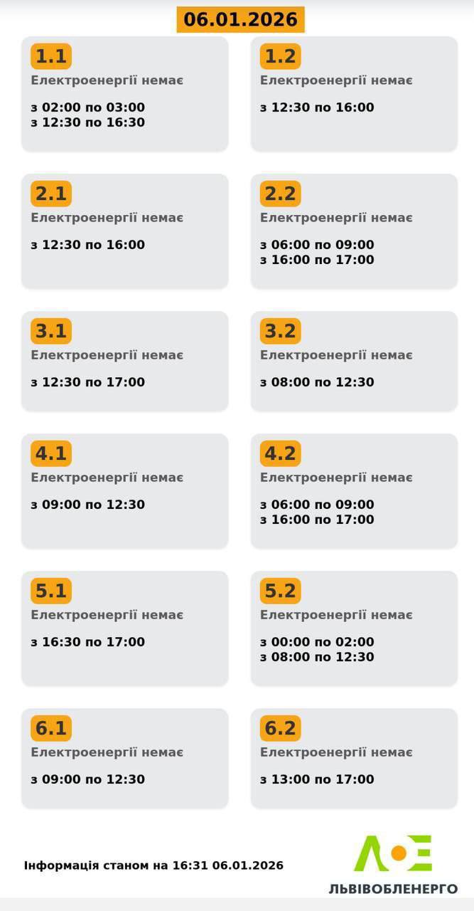 На Львівщині у вівторок, 6 січня, будуть діяти графіки відключень електроенергії. Світло вимикатимуть усім групам. Про це повідомили у Львівобленерго. Актуальний графік Інформація станом на 16:31 06.01.2026 Група 1.1. Електроенергії немає з 02:00 до 03:00, з 12:30 до 16:30. Група 1.2. Електроенергії немає з 12:30 до 16:00. Група 2.1. Електроенергії немає з 12:30 до 16:00. Група 2.2. Електроенергії немає з 06:00 до 09:00, з 16:00 до 17:00. Група 3.1. Електроенергії немає з 12:30 до 17:00. Група 3.2. Електроенергії немає з 08:00 до 12:30. Група 4.1. Електроенергії немає з 09:00 до 12:30. Група 4.2. Електроенергії немає з 06:00 до 09:00, з 16:00 до 17:00. Група 5.1. Електроенергії немає з 16:30 до 17:00. Група 5.2. Електроенергії немає з 00:00 до 02:00, з 08:00 до 12:30. Група 6.1. Електроенергії немає з 09:00 до 12:30. Група 6.2. Електроенергії немає з 13:00 до 17:00. До слова, дізнатись свою чергу аварійних чи погодинних відключень можна: на сайті “Львівобленерго” у розділі «Чому немає світла»: https://poweron.loe.lviv.ua/ У чат-ботах: “Львівобленерго” у Viber (для побутових споживачів): https://www.viber.com/loebot “Львівобленерго” у Telegram (для побутових споживачів): https://t.me/loeserviceBot “Львівобленерго Бізнес” у Viber (для юридичних споживачів): www.viber.com/loebiznesbot “Львівобленерго Бізнес” у Telegram (для юридичних споживачів): https://t.me/loebiznesbot у мобільному застосунку КомКом: https://loe.lviv.ua/page/komkom-app