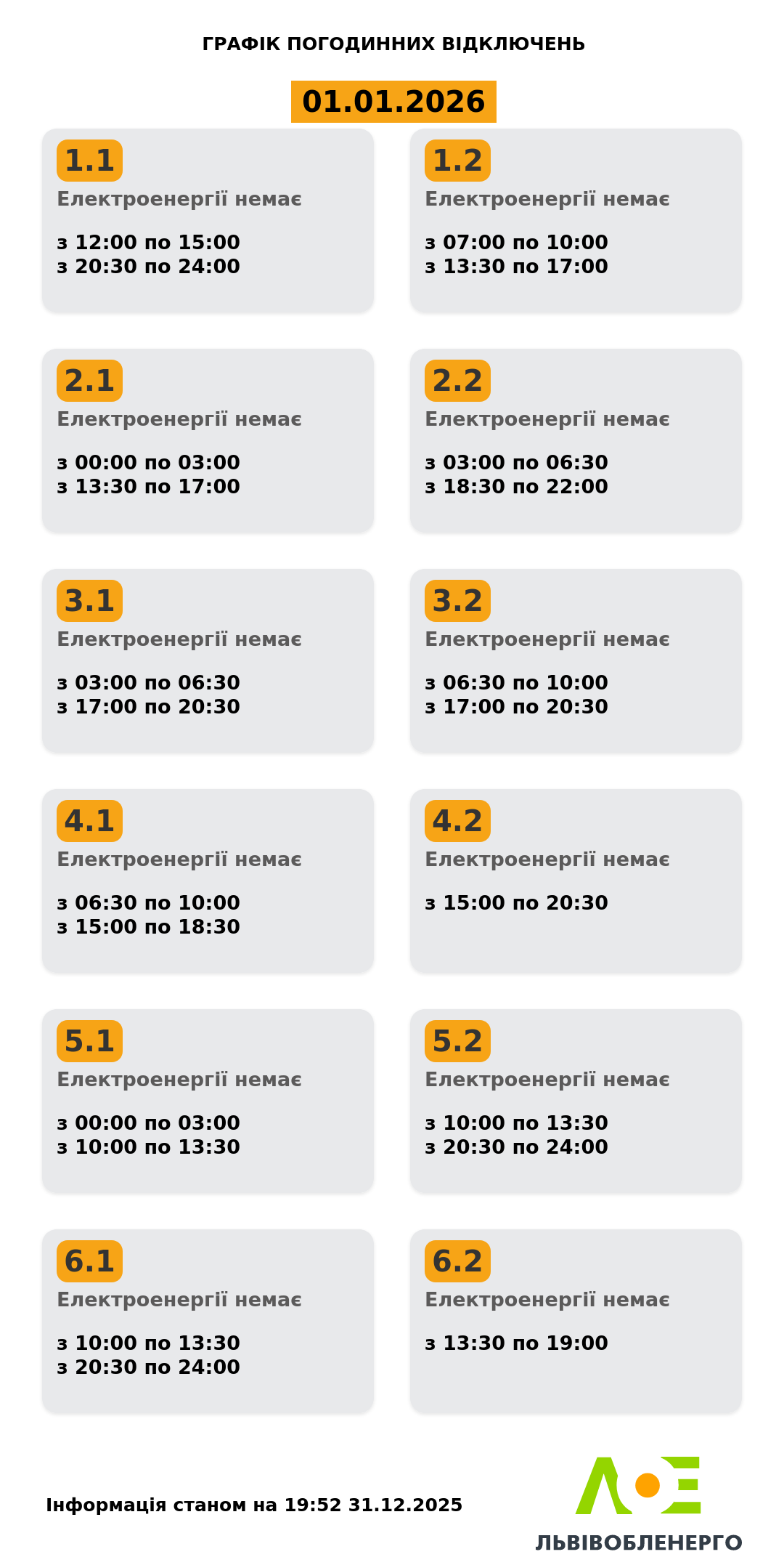 У четвер, 1 січня, у Львівській області знову діятимуть погодинні графіки відключень електроенергії. Світло вимикатимуть усім групам. Про це повідомили у Львівобленерго. Актуальний графік Інформація станом на 19:58 31.12.2025 Група 1.1. Електроенергії не буде з 12:00 по 15:00 і з 20:30 по 24:00 Група 1.2. Електроенергії не буде з 07:00 по 10:00 і з 13:30 по 17:00 Група 2.1. Електроенергії не буде з 00:00 по 03:00 і з 13:30 по 17:00 Група 2.2. Електроенергії не буде з 03:00 по 06:30 і з 18:30 по 22:00 Група 3.1. Електроенергії не буде з 03:00 по 06:30 і з 17:00 по 20:30 Група 3.2. Електроенергії не буде з 06:30 по 10:00 і з 17:00 по 20:30 Група 4.1. Електроенергії не буде з 06:30 по 10:00 і з 15:00 по 18:30 Група 4.2. Електроенергії не буде з 15:00 по 20:30 Група 5.1. Електроенергії не буде з 00:00 по 03:00 і з 10:00 по 13:30 Група 5.2. Електроенергії не буде з 10:00 по 13:30 і з 20:30 по 24:00 Група 6.1. Електроенергії не буде з 10:00 по 13:30 і з 20:30 по 24:00 Група 6.2. Електроенергії не буде з 13:30 по 19:00. Як дізнатися свою групу відключень До слова, дізнатись свою чергу аварійних чи погодинних відключень можна: на сайті “Львівобленерго” у розділі «Чому немає світла»: https://poweron.loe.lviv.ua/ У чат-ботах: “Львівобленерго” у Viber (для побутових споживачів): https://www.viber.com/loebot “Львівобленерго” у Telegram (для побутових споживачів): https://t.me/loeserviceBot “Львівобленерго Бізнес” у Viber (для юридичних споживачів): www.viber.com/loebiznesbot “Львівобленерго Бізнес” у Telegram (для юридичних споживачів): https://t.me/loebiznesbot у мобільному застосунку КомКом: https://loe.lviv.ua/page/komkom-app