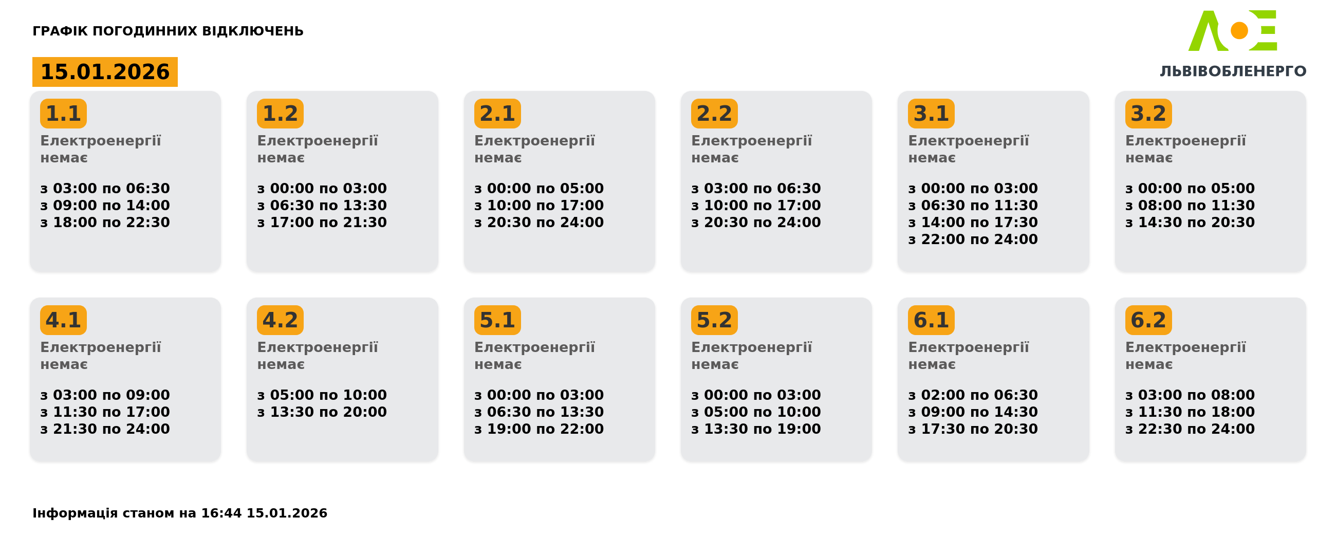 У четвер, 15 січня, на Львівщині діятимуть графіки відключення світла. Електроенергію вимикатимуть усім групам. Світла не буде майже по 14 годин для окремих груп. Про це повідомили у Львівобленерго. Актуальний графік Інформація станом на 16:44 15.01.2026 Група 1.1. Електроенергії немає з 03:00 до 06:30, з 09:00 до 14:00, з 18:00 до 22:30. Група 1.2. Електроенергії немає з 00:00 до 03:00, з 06:30 до 13:30, з 17:00 до 21:30. Група 2.1. Електроенергії немає з 00:00 до 05:00, з 10:00 до 17:00, з 20:30 до 24:00. Група 2.2. Електроенергії немає з 03:00 до 06:30, з 10:00 до 17:00, з 20:30 до 24:00. Група 3.1. Електроенергії немає з 00:00 до 03:00, з 06:30 до 11:30, з 14:00 до 17:30, з 22:00 до 24:00. Група 3.2. Електроенергії немає з 00:00 до 05:00, з 08:00 до 11:30, з 14:30 до 20:30. Група 4.1. Електроенергії немає з 03:00 до 09:00, з 11:30 до 17:00, з 21:30 до 24:00. Група 4.2. Електроенергії немає з 05:00 до 10:00, з 13:30 до 20:00. Група 5.1. Електроенергії немає з 00:00 до 03:00, з 06:30 до 13:30, з 19:00 до 22:00. Група 5.2. Електроенергії немає з 00:00 до 03:00, з 05:00 до 10:00, з 13:30 до 19:00. Група 6.1. Електроенергії немає з 02:00 до 06:30, з 09:00 до 14:30, з 17:30 до 20:30. Група 6.2. Електроенергії немає з 03:00 до 08:00, з 11:30 до 18:00, з 22:30 до 24:00. Як дізнатися свою групу відключень До слова, дізнатись свою чергу аварійних чи погодинних відключень можна: на сайті “Львівобленерго” у розділі «Чому немає світла»: https://poweron.loe.lviv.ua/ У чат-ботах: “Львівобленерго” у Viber (для побутових споживачів): https://www.viber.com/loebot “Львівобленерго” у Telegram (для побутових споживачів): https://t.me/loeserviceBot “Львівобленерго Бізнес” у Viber (для юридичних споживачів): www.viber.com/loebiznesbot “Львівобленерго Бізнес” у Telegram (для юридичних споживачів): https://t.me/loebiznesbot у мобільному застосунку КомКом: https://loe.lviv.ua/page/komkom-app