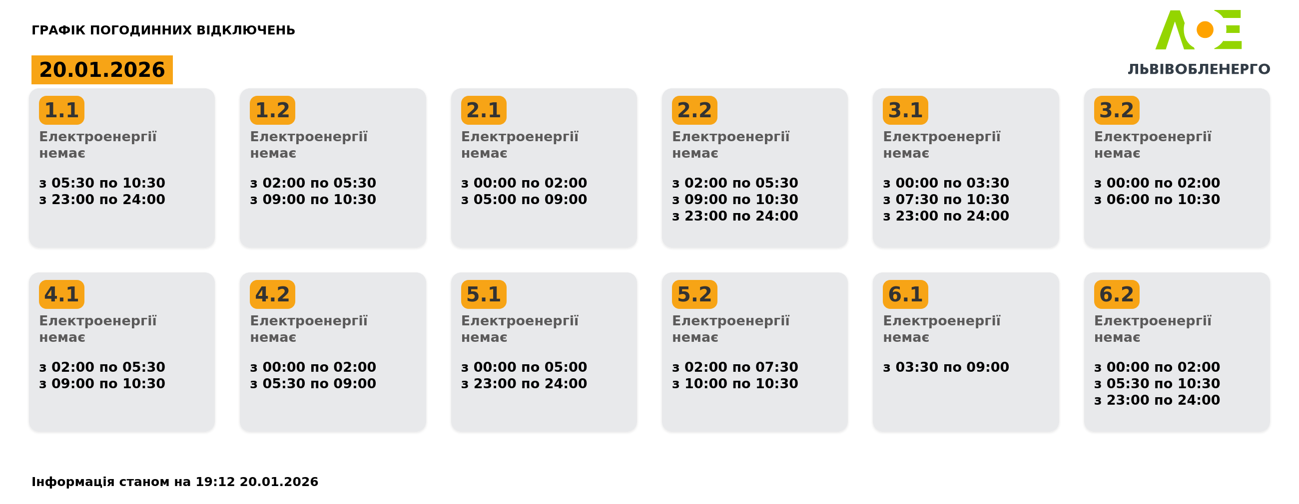 У вівторок, 20 січня, на Львівщині діятимуть графіки відключення світла. Електроенергію будуть вимикати усім групам. Найбільше відключень у групи 3.2 та 5.2 — по 15 годин. Натомість найменше світло вимикатимуть групам 2.1 та 6.1 — по 12 з половиною годин. Про це повідомили у Львівобленерго. Актуальний графік Інформація станом на 19:12 20.01.2026 Група 1.1. Електроенергії немає з 05:30 до 10:30, з 23:00 до 24:00. Група 1.2. Електроенергії немає з 02:00 до 05:30, з 09:00 до 10:30. Група 2.1. Електроенергії немає з 00:00 до 02:00, з 05:00 до 09:00. Група 2.2. Електроенергії немає з 02:00 до 05:30, з 09:00 до 10:30, з 23:00 до 24:00. Група 3.1. Електроенергії немає з 00:00 до 03:30, з 07:30 до 10:30, з 23:00 до 24:00. Група 3.2. Електроенергії немає з 00:00 до 02:00, з 06:00 до 10:30. Група 4.1. Електроенергії немає з 02:00 до 05:30, з 09:00 до 10:30. Група 4.2. Електроенергії немає з 00:00 до 02:00, з 05:30 до 09:00. Група 5.1. Електроенергії немає з 00:00 до 05:00, з 23:00 до 24:00. Група 5.2. Електроенергії немає з 02:00 до 07:30, з 10:00 до 10:30. Група 6.1. Електроенергії немає з 03:30 до 09:00. Група 6.2. Електроенергії немає з 00:00 до 02:00, з 05:30 до 10:30, з 23:00 до 24:00. Як дізнатися свою групу відключень До слова, дізнатись свою чергу аварійних чи погодинних відключень можна: на сайті “Львівобленерго” у розділі «Чому немає світла»: https://poweron.loe.lviv.ua/ У чат-ботах: “Львівобленерго” у Viber (для побутових споживачів): https://www.viber.com/loebot “Львівобленерго” у Telegram (для побутових споживачів): https://t.me/loeserviceBot “Львівобленерго Бізнес” у Viber (для юридичних споживачів): www.viber.com/loebiznesbot “Львівобленерго Бізнес” у Telegram (для юридичних споживачів): https://t.me/loebiznesbot у мобільному застосунку КомКом: https://loe.lviv.ua/page/komkom-app