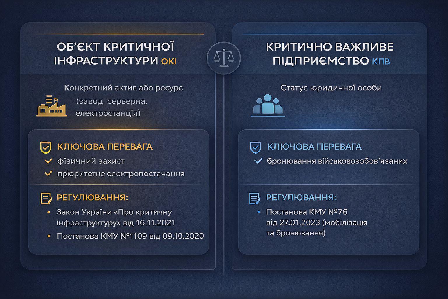 У Львівській обласній військовій адміністрації роз’яснили різницю між статусами «критично важливого підприємства» та «об’єкта критичної інфраструктури». Перший заступник голови Львівської ОВА Андрій Годик пояснив, чому статус критично важливого підприємства не дає права на пріоритетне електропостачання. Що важливо знати: Статус «критично важливого підприємства» дає право бронювати працівників для роботи під час війни, але це не дає права на пріоритетне електропостачання. Натомість «об’єкт критичної інфраструктури» — це підприємства, які можуть отримати гарантоване електропостачання, навіть під час блекаутів. Щоб отримати цей статус, підприємство має бути внесене до Реєстру об’єктів критичної інфраструктури, відповідати вимогам Закону України «Про критичну інфраструктуру» та критеріям, зазначеним у Постанові №1109. Якщо підприємство не внесене до Реєстру об’єктів критичної інфраструктури, то воно не має права на пріоритетне електропостачання. Водночас, для підприємств, які не потрапили до цього реєстру, але все ж хочуть уникнути графіків відключень, існує альтернатива. Годик пояснив, що відповідно до Постанови №1127, підприємства можуть імпортувати не менше 60% необхідної для роботи електроенергії. У такому випадку, на ці підприємства не поширюються обмеження щодо електропостачання, навіть якщо вони не є об’єктами критичної інфраструктури. “Я недарма прописав всі номери цих нормативних документів, якшо досі у вас виникають питання, прошу, читайте та застосовуйте. І знову наголошу, шляхи є два: або юридично доводити, що ви об’єкт критичної інфраструктури (через Реєстр), або купувати імпорт”, — зазначив Андрій Годик. Більшість об'єктів у Львові не мають статусу критичної інфраструктури Нагадаємо, що у Львові 7 січня сталися відключення світла у деяких лікарнях та в електротранспорті згідно з графіками, що викликало численні труднощі для обслуговування громадян. Після цього Юлія Свириденко ініціювала перевірку, яка показала, що більшість об'єктів на Львівщині не мали статусу критичної інфраструктури. Зокрема, жоден з 17 об’єктів «Львівелектротрансу» та медичних закладів Львівської громади не був оформлений як критичний. Перевірку пройшли 150 об’єктів різних галузей, і лише частина з них має потрібний статус. У результаті, комунальний електротранспорт у Львові не зміг працювати через відключення світла 7 січня. Керівництво «Львівелектротрансу» запевнило, що вже подало документи для оформлення статусу критичності після публічного скандалу. Окрім транспорту та медицини, перевірили також об’єкти ЖКГ та енергетики, де лише 42 з 100 підприємств мають статус критичних.