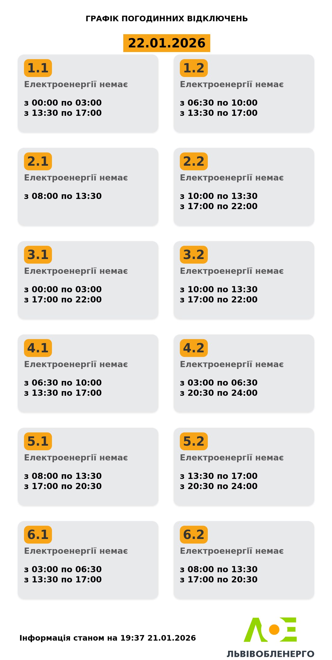 У четвер, 22 січня, на Львівщині діятимуть графіки погодинних відключень електроенергії. Світло вимикатимуть у всіх групах. Найбільша тривалість відключень передбачена для груп 5.1 та 6.2 — по 9 годин. Найкоротші відключення заплановані для групи 2.1 — 5 годин 30 хвилин. Шептицький район відтепер знову входить до загального графіка погодинних відключень. Про це повідомили у Львівобленерго. Актуальний графік Інформація станом на 19:37 21.01.2026 Група 1.1. Електроенергії немає з 00:00 до 03:00, з 13:30 до 17:00. Група 1.2. Електроенергії немає з 06:30 до 10:00, з 13:30 до 17:00. Група 2.1. Електроенергії немає з 08:00 до 13:30. Група 2.2. Електроенергії немає з 10:00 до 13:30, з 17:00 до 22:00. Група 3.1. Електроенергії немає з 00:00 до 03:00, з 17:00 до 22:00. Група 3.2. Електроенергії немає з 10:00 до 13:30, з 17:00 до 22:00. Група 4.1. Електроенергії немає з 06:30 до 10:00, з 13:30 до 17:00. Група 4.2. Електроенергії немає з 03:00 до 06:30, з 20:30 до 24:00. Група 5.1. Електроенергії немає з 08:00 до 13:30, з 17:00 до 20:30. Група 5.2. Електроенергії немає з 13:30 до 17:00, з 20:30 до 24:00. Група 6.1. Електроенергії немає з 03:00 до 06:30, з 13:30 до 17:00. Група 6.2. Електроенергії немає з 08:00 до 13:30, з 17:00 до 20:30. Як дізнатися свою групу відключень До слова, дізнатись свою чергу аварійних чи погодинних відключень можна: на сайті “Львівобленерго” у розділі «Чому немає світла»: https://poweron.loe.lviv.ua/ У чат-ботах: “Львівобленерго” у Viber (для побутових споживачів): https://www.viber.com/loebot “Львівобленерго” у Telegram (для побутових споживачів): https://t.me/loeserviceBot “Львівобленерго Бізнес” у Viber (для юридичних споживачів): www.viber.com/loebiznesbot “Львівобленерго Бізнес” у Telegram (для юридичних споживачів): https://t.me/loebiznesbot у мобільному застосунку КомКом: https://loe.lviv.ua/page/komkom-app