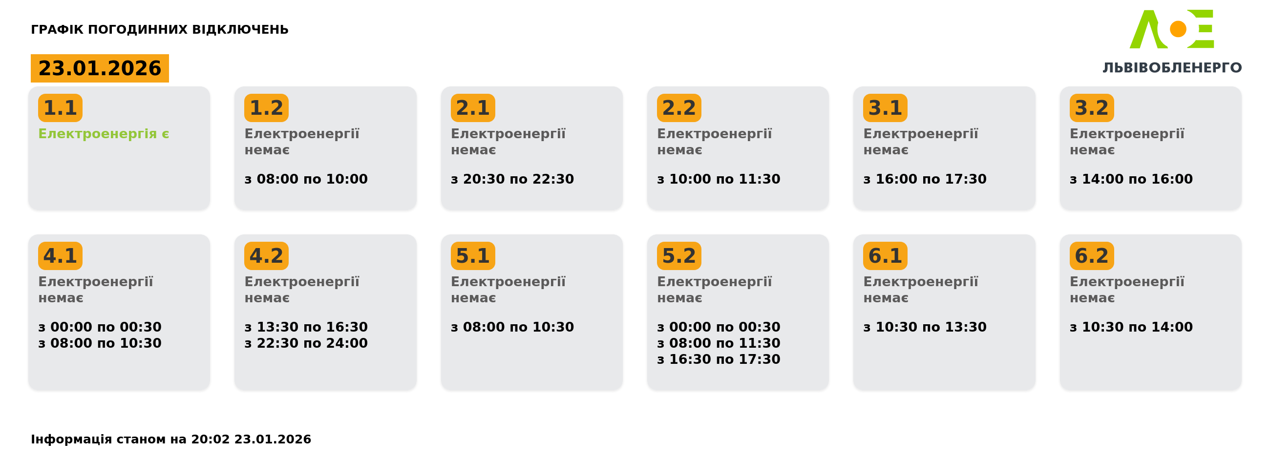 На Львівщині у п’ятницю, 23 січня, діятимуть графіки відключення світла. Електроенергію вимикатимуть усім групам. Світла не буде до 16 годин на день. Про це повідомили у Львівобленерго. Актуальний графік Інформація станом на 20:02 23.01.2026 Група 1.1. Електроенергія є. Група 1.2. Електроенергії немає з 08:00 до 10:00. Група 2.1. Електроенергії немає з 20:30 до 22:30. Група 2.2. Електроенергії немає з 10:00 до 11:30. Група 3.1. Електроенергії немає з 16:00 до 17:30. Група 3.2. Електроенергії немає з 14:00 до 16:00. Група 4.1. Електроенергії немає з 00:00 до 00:30, з 08:00 до 10:30. Група 4.2. Електроенергії немає з 13:30 до 16:30, з 22:30 до 24:00. Група 5.1. Електроенергії немає з 08:00 до 10:30. Група 5.2. Електроенергії немає з 00:00 до 00:30, з 08:00 до 11:30, з 16:30 до 17:30. Група 6.1. Електроенергії немає з 10:30 до 13:30. Група 6.2. Електроенергії немає з 10:30 до 14:00. Як дізнатися свою групу відключень До слова, дізнатись свою чергу аварійних чи погодинних відключень можна: на сайті “Львівобленерго” у розділі «Чому немає світла»: https://poweron.loe.lviv.ua/ У чат-ботах: “Львівобленерго” у Viber (для побутових споживачів): https://www.viber.com/loebot “Львівобленерго” у Telegram (для побутових споживачів): https://t.me/loeserviceBot “Львівобленерго Бізнес” у Viber (для юридичних споживачів): www.viber.com/loebiznesbot “Львівобленерго Бізнес” у Telegram (для юридичних споживачів): https://t.me/loebiznesbot у мобільному застосунку КомКом: https://loe.lviv.ua/page/komkom-app