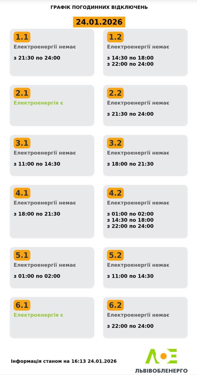 На Львівщині у суботу, 24 січня, діятимуть графіки відключення світла. Електроенергію вимикатимуть усім групам до чотирьох разів на день. Про це повідомили у Львівобленерго. Актуальний графік Інформація станом на 16:13 24.01.2026 Група 1.1. Електроенергії немає з 21:30 до 24:00. Група 1.2. Електроенергії немає з 14:30 до 18:00, з 22:00 до 24:00. Група 2.1. Електроенергія є. Група 2.2. Електроенергії немає з 21:30 до 24:00. Група 3.1. Електроенергії немає з 11:00 до 14:30. Група 3.2. Електроенергії немає з 18:00 до 21:30. Група 4.1. Електроенергії немає з 18:00 до 21:30. Група 4.2. Електроенергії немає з 01:00 до 02:00, з 14:30 до 18:00, з 22:00 до 24:00. Група 5.1. Електроенергії немає з 01:00 до 02:00. Група 5.2. Електроенергії немає з 11:00 до 14:30. Група 6.1. Електроенергія є. Група 6.2. Електроенергії немає з 22:00 до 24:00. Як дізнатися свою групу відключень До слова, дізнатись свою чергу аварійних чи погодинних відключень можна: на сайті “Львівобленерго” у розділі «Чому немає світла»: https://poweron.loe.lviv.ua/ У чат-ботах: “Львівобленерго” у Viber (для побутових споживачів): https://www.viber.com/loebot “Львівобленерго” у Telegram (для побутових споживачів): https://t.me/loeserviceBot “Львівобленерго Бізнес” у Viber (для юридичних споживачів): www.viber.com/loebiznesbot “Львівобленерго Бізнес” у Telegram (для юридичних споживачів): https://t.me/loebiznesbot у мобільному застосунку КомКом: https://loe.lviv.ua/page/komkom-app