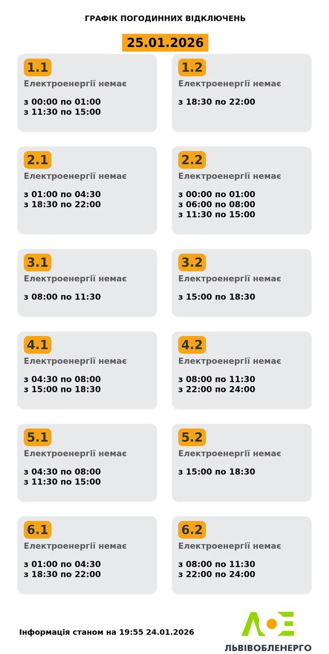 У неділю, 25 січня, на Львівщині діятимуть графіки відключення світла. Протягом дня графіки можуть змінитися. Про це повідомили у Львівобленерго. Актуальний графік Інформація станом на 19:55 24.01.2026 Група 1.1. Електроенергії немає з 00:00 до 01:00, з 11:30 до 15:00. Група 1.2. Електроенергії немає з 18:30 до 22:00. Група 2.1. Електроенергії немає з 01:00 до 04:30, з 18:30 до 22:00. Група 2.2. Електроенергії немає з 00:00 до 01:00, з 06:00 до 08:00, з 11:30 до 15:00. Група 3.1. Електроенергії немає з 08:00 до 11:30. Група 3.2. Електроенергії немає з 15:00 до 18:30. Група 4.1. Електроенергії немає з 04:30 до 08:00, з 15:00 до 18:30. Група 4.2. Електроенергії немає з 08:00 до 11:30, з 22:00 до 24:00. Група 5.1. Електроенергії немає з 04:30 до 08:00, з 11:30 до 15:00. Група 5.2. Електроенергії немає з 15:00 до 18:30. Група 6.1. Електроенергії немає з 01:00 до 04:30, з 18:30 до 22:00. Група 6.2. Електроенергії немає з 08:00 до 11:30, з 22:00 до 24:00. Як дізнатися свою групу відключень До слова, дізнатись свою чергу аварійних чи погодинних відключень можна: на сайті “Львівобленерго” у розділі «Чому немає світла»: https://poweron.loe.lviv.ua/ У чат-ботах: “Львівобленерго” у Viber (для побутових споживачів): https://www.viber.com/loebot “Львівобленерго” у Telegram (для побутових споживачів): https://t.me/loeserviceBot “Львівобленерго Бізнес” у Viber (для юридичних споживачів): www.viber.com/loebiznesbot “Львівобленерго Бізнес” у Telegram (для юридичних споживачів): https://t.me/loebiznesbot у мобільному застосунку КомКом: https://loe.lviv.ua/page/komkom-app
