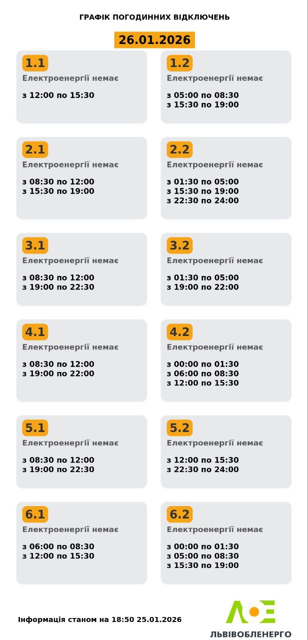 На Львівщині у понеділок, 26 січня, діятимуть графіки відключення світла. Електроенергію вимикатимуть усім групам. Про це повідомили у Львівобленерго. Актуальний графік Інформація станом на 18:50 25.01.2026 Група 1.1. Електроенергії немає з 12:00 до 15:30. Група 1.2. Електроенергії немає з 05:00 до 08:30, з 15:30 до 19:00. Група 2.1. Електроенергії немає з 08:30 до 12:00, з 15:30 до 19:00. Група 2.2. Електроенергії немає з 01:30 до 05:00, з 15:30 до 19:00, з 22:30 до 24:00. Група 3.1. Електроенергії немає з 08:30 до 12:00, з 19:00 до 22:30. Група 3.2. Електроенергії немає з 01:30 до 05:00, з 19:00 до 22:00. Група 4.1. Електроенергії немає з 08:30 до 12:00, з 19:00 до 22:00. Група 4.2. Електроенергії немає з 00:00 до 01:30, з 06:00 до 08:30, з 12:00 до 15:30. Група 5.1. Електроенергії немає з 08:30 до 12:00, з 19:00 до 22:30. Група 5.2. Електроенергії немає з 12:00 до 15:30, з 22:30 до 24:00. Група 6.1. Електроенергії немає з 06:00 до 08:30, з 12:00 до 15:30. Група 6.2. Електроенергії немає з 00:00 до 01:30, з 05:00 до 08:30, з 15:30 до 19:00. Як дізнатися свою групу відключень До слова, дізнатись свою чергу аварійних чи погодинних відключень можна: на сайті “Львівобленерго” у розділі «Чому немає світла»: https://poweron.loe.lviv.ua/ У чат-ботах: “Львівобленерго” у Viber (для побутових споживачів): https://www.viber.com/loebot “Львівобленерго” у Telegram (для побутових споживачів): https://t.me/loeserviceBot “Львівобленерго Бізнес” у Viber (для юридичних споживачів): www.viber.com/loebiznesbot “Львівобленерго Бізнес” у Telegram (для юридичних споживачів): https://t.me/loebiznesbot у мобільному застосунку КомКом: https://loe.lviv.ua/page/komkom-app