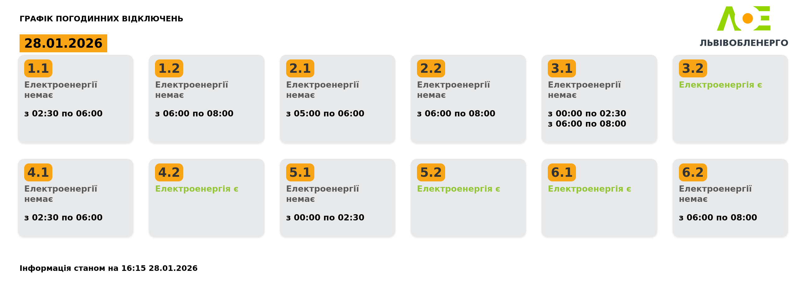 У середу, 28 січня, на Львівщині діятимуть графіки відключення світла. Протягом дня графіки можуть змінитися. Про це повідомили у Львівобленерго. Актуальний графік Інформація станом на 16:15 28.01.2026 Група 1.1. Електроенергії немає з 02:30 до 06:00. Група 1.2. Електроенергії немає з 06:00 до 08:00. Група 2.1. Електроенергії немає з 05:00 до 06:00. Група 2.2. Електроенергії немає з 06:00 до 08:00. Група 3.1. Електроенергії немає з 00:00 до 02:30, з 06:00 до 08:00. Група 3.2. Електроенергія є. Група 4.1. Електроенергії немає з 02:30 до 06:00. Група 4.2. Електроенергія є. Група 5.1. Електроенергії немає з 00:00 до 02:30. Група 5.2. Електроенергія є. Група 6.1. Електроенергія є. Група 6.2. Електроенергії немає з 06:00 до 08:00. Як дізнатися свою групу відключень До слова, дізнатись свою чергу аварійних чи погодинних відключень можна: на сайті “Львівобленерго” у розділі «Чому немає світла»: https://poweron.loe.lviv.ua/ У чат-ботах: “Львівобленерго” у Viber (для побутових споживачів): https://www.viber.com/loebot “Львівобленерго” у Telegram (для побутових споживачів): https://t.me/loeserviceBot “Львівобленерго Бізнес” у Viber (для юридичних споживачів): www.viber.com/loebiznesbot “Львівобленерго Бізнес” у Telegram (для юридичних споживачів): https://t.me/loebiznesbot у мобільному застосунку КомКом: https://loe.lviv.ua/page/komkom-app