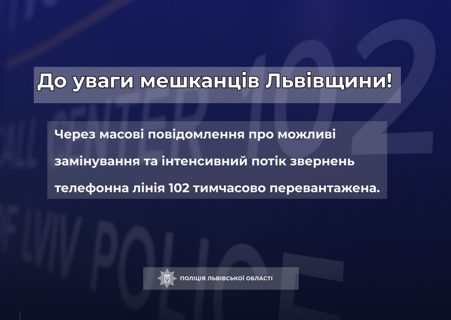 У поліції Львівщини повідомили, що через масові звернення, які надходять від ранку п’ятниці, 30 січня, телефонна лінія 102 тимчасово перевантажена. Правоохоронці закликають звертатися через застосунок 112 Ukraine, якщо потрібно терміново отримати допомогу. Повідомлення опрацьовують в порядку черги Масові повідомлення про можливі замінування почали надходити на електронні адреси органів державної влади, місцевого самоврядування, навчальних закладів, підприємств та інших установ. До підрозділів поліції надійшло більше 2000 повідомлень з різних регіонів України, зокрема з Львівської області, Києва, Одеської, Харківської, Вінницької та інших областей. Поліція вживає всіх необхідних заходів для перевірки об’єктів. Станом на 12:10 годину, понад 30% повідомлень вже було перевірено, і інформація про замінування на цих об'єктах не підтвердилась. Перевірка інших об’єктів триває. Правоохоронці наголошують, що усі звернення обробляються в порядку черги, тому просять громадян зберігати спокій та по можливості уникати зайвих дзвінків на лінію 102. В разі необхідності громадяни можуть звертатися до Служби 112 за допомогою мобільного додатку 112 Ukraine.