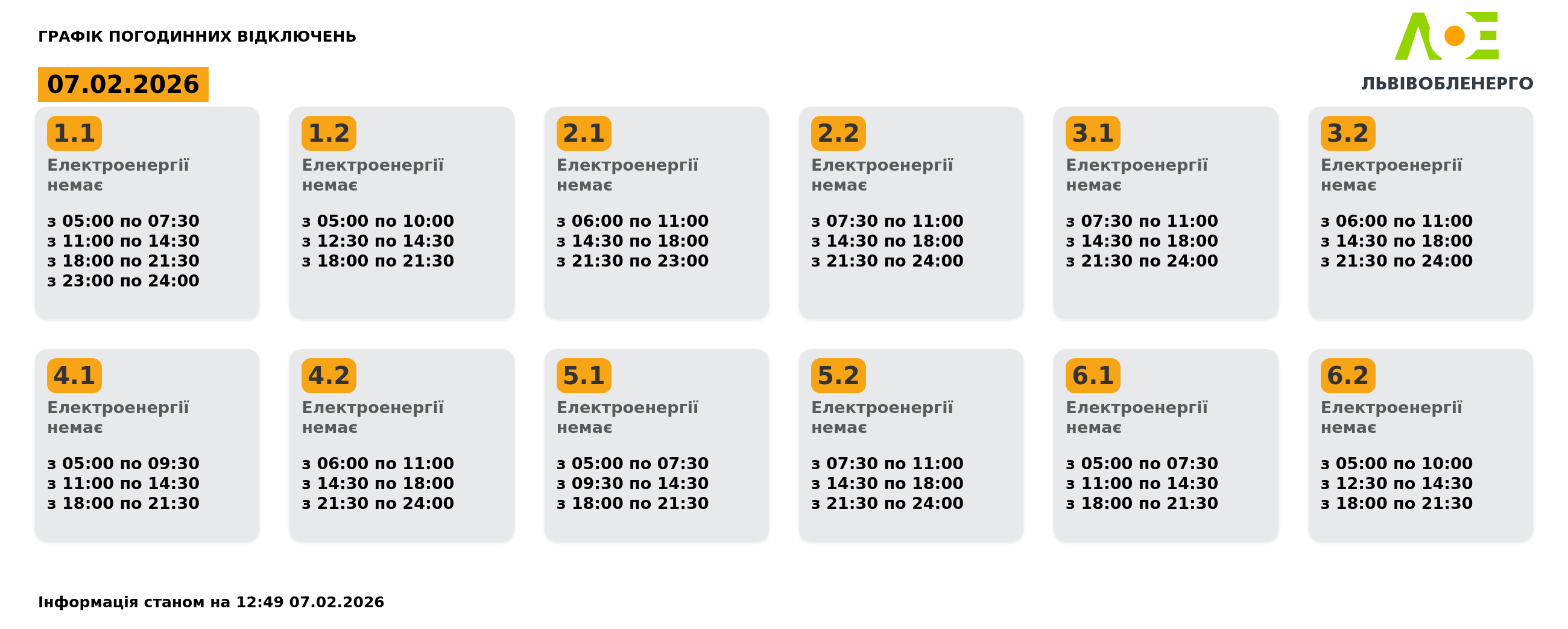 У суботу, 7 лютого, на Львівщині будуть діяти графіки відключення світла. Світло вимикатимуть усім групам впродовж доби. Про це повідомили у Львівобленерго. Актуальний графік Інформація станом на 12:49 07.02.2026 Група 1.1. Електроенергії немає з 05:00 до 07:30, з 11:00 до 14:30, з 18:00 до 21:30, з 23:00 до 24:00. Група 1.2. Електроенергії немає з 05:00 до 10:00, з 12:30 до 14:30, з 18:00 до 21:30. Група 2.1. Електроенергії немає з 06:00 до 11:00, з 14:30 до 18:00, з 21:30 до 23:00. Група 2.2. Електроенергії немає з 07:30 до 11:00, з 14:30 до 18:00, з 21:30 до 24:00. Група 3.1. Електроенергії немає з 07:30 до 11:00, з 14:30 до 18:00, з 21:30 до 24:00. Група 3.2. Електроенергії немає з 06:00 до 11:00, з 14:30 до 18:00, з 21:30 до 24:00. Група 4.1. Електроенергії немає з 05:00 до 09:30, з 11:00 до 14:30, з 18:00 до 21:30. Група 4.2. Електроенергії немає з 06:00 до 11:00, з 14:30 до 18:00, з 21:30 до 24:00. Група 5.1. Електроенергії немає з 05:00 до 07:30, з 09:30 до 14:30, з 18:00 до 21:30. Група 5.2. Електроенергії немає з 07:30 до 11:00, з 14:30 до 18:00, з 21:30 до 24:00. Група 6.1. Електроенергії немає з 05:00 до 07:30, з 11:00 до 14:30, з 18:00 до 21:30. Група 6.2. Електроенергії немає з 05:00 до 10:00, з 12:30 до 14:30, з 18:00 до 21:30. Як дізнатися свою групу відключень До слова, дізнатись свою чергу аварійних чи погодинних відключень можна: на сайті “Львівобленерго” у розділі «Чому немає світла»: https://poweron.loe.lviv.ua/ У чат-ботах: “Львівобленерго” у Viber (для побутових споживачів): https://www.viber.com/loebot “Львівобленерго” у Telegram (для побутових споживачів): https://t.me/loeserviceBot “Львівобленерго Бізнес” у Viber (для юридичних споживачів): www.viber.com/loebiznesbot “Львівобленерго Бізнес” у Telegram (для юридичних споживачів): https://t.me/loebiznesbot у мобільному застосунку КомКом: https://loe.lviv.ua/page/komkom-app