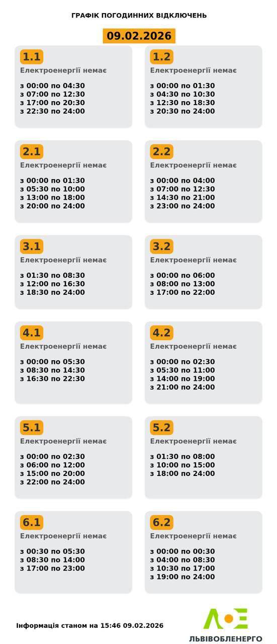 У понеділок, 9 лютого, на Львівщині будуть діяти графіки відключення світла. Світло вимикатимуть усім групам впродовж доби. Про це повідомили у Львівобленерго. Актуальний графік Інформація станом на 15:46 09.02.2026 Група 1.1. Електроенергії немає з 00:00 до 04:30, з 07:00 до 12:30, з 17:00 до 20:30, з 22:30 до 24:00. Група 1.2. Електроенергії немає з 00:00 до 01:30, з 04:30 до 10:30, з 12:30 до 18:30, з 20:30 до 24:00. Група 2.1. Електроенергії немає з 00:00 до 01:30, з 05:30 до 10:00, з 13:00 до 18:00, з 20:00 до 24:00. Група 2.2. Електроенергії немає з 00:00 до 04:00, з 07:00 до 12:30, з 14:30 до 21:00, з 23:00 до 24:00. Група 3.1. Електроенергії немає з 01:30 до 08:30, з 12:00 до 16:30, з 18:30 до 24:00. Група 3.2. Електроенергії немає з 00:00 до 06:00, з 08:00 до 13:00, з 17:00 до 22:00. Група 4.1. Електроенергії немає з 00:00 до 05:30, з 08:30 до 14:30, з 16:30 до 22:30. Група 4.2. Електроенергії немає з 00:00 до 02:30, з 05:30 до 11:00, з 14:00 до 19:00, з 21:00 до 24:00. Група 5.1. Електроенергії немає з 00:00 до 02:30, з 06:00 до 12:00, з 15:00 до 20:00, з 22:00 до 24:00. Група 5.2. Електроенергії немає з 01:30 до 08:00, з 10:00 до 15:00, з 18:00 до 24:00. Група 6.1. Електроенергії немає з 00:30 до 05:30, з 08:30 до 14:00, з 17:00 до 23:00. Група 6.2. Електроенергії немає з 00:00 до 00:30, з 04:00 до 08:30, з 10:30 до 17:00, з 19:00 до 24:00. Як дізнатися свою групу відключень До слова, дізнатись свою чергу аварійних чи погодинних відключень можна: на сайті “Львівобленерго” у розділі «Чому немає світла»: https://poweron.loe.lviv.ua/ У чат-ботах: “Львівобленерго” у Viber (для побутових споживачів): https://www.viber.com/loebot “Львівобленерго” у Telegram (для побутових споживачів): https://t.me/loeserviceBot “Львівобленерго Бізнес” у Viber (для юридичних споживачів): www.viber.com/loebiznesbot “Львівобленерго Бізнес” у Telegram (для юридичних споживачів): https://t.me/loebiznesbot у мобільному застосунку КомКом: https://loe.lviv.ua/page/komkom-app