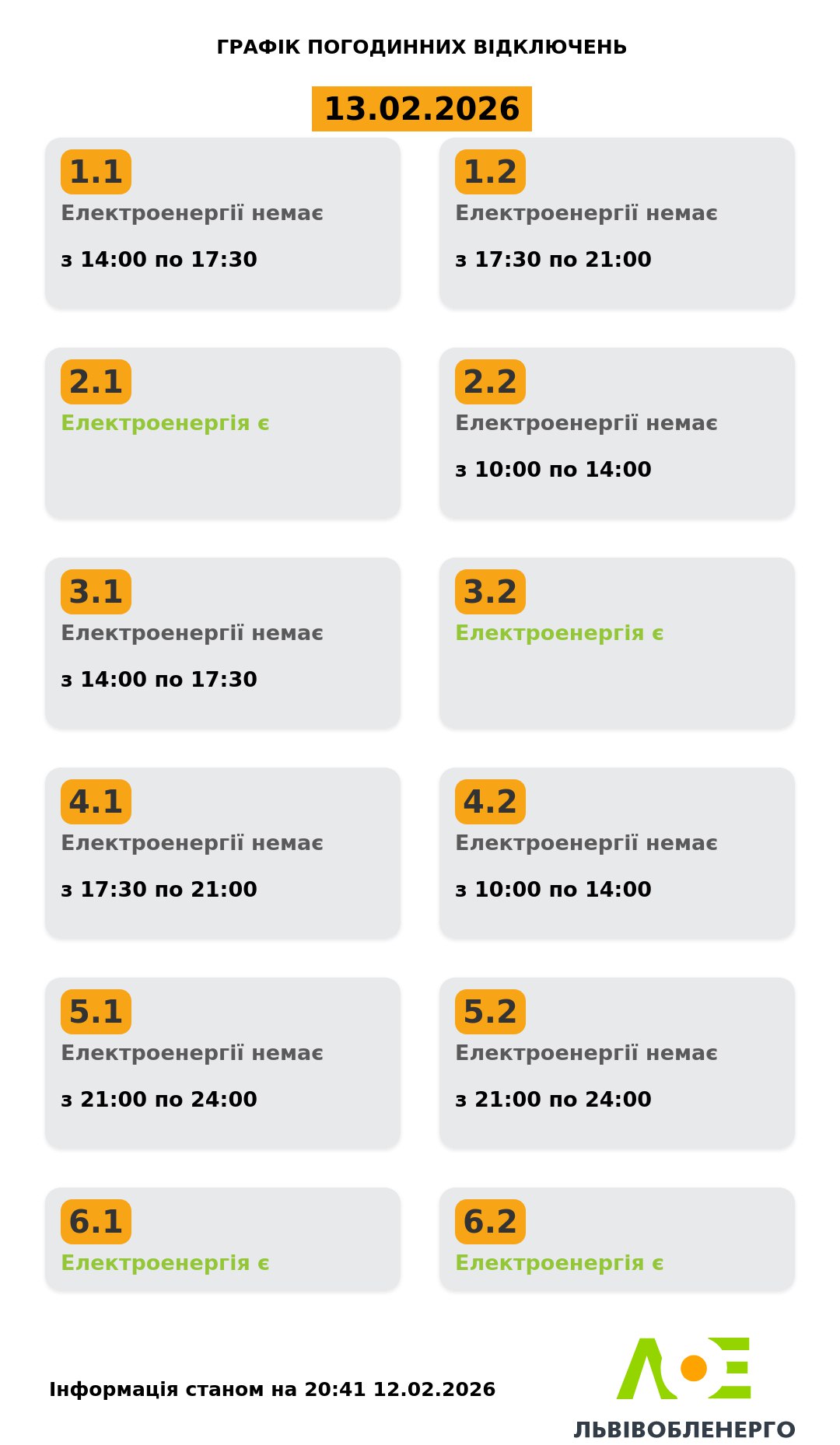 У п’ятницю, 13 лютого, на Львівщині будуть діяти графіки відключення світла. Світло вимикатимуть лише деяким групам впродовж доби. Про це повідомили у Львівобленерго. Актуальний графік Як дізнатися свою групу відключень До слова, дізнатись свою чергу аварійних чи погодинних відключень можна: на сайті “Львівобленерго” у розділі «Чому немає світла»: https://poweron.loe.lviv.ua/ У чат-ботах: “Львівобленерго” у Viber (для побутових споживачів): https://www.viber.com/loebot “Львівобленерго” у Telegram (для побутових споживачів): https://t.me/loeserviceBot “Львівобленерго Бізнес” у Viber (для юридичних споживачів): www.viber.com/loebiznesbot “Львівобленерго Бізнес” у Telegram (для юридичних споживачів): https://t.me/loebiznesbot у мобільному застосунку КомКом: https://loe.lviv.ua/page/komkom-app